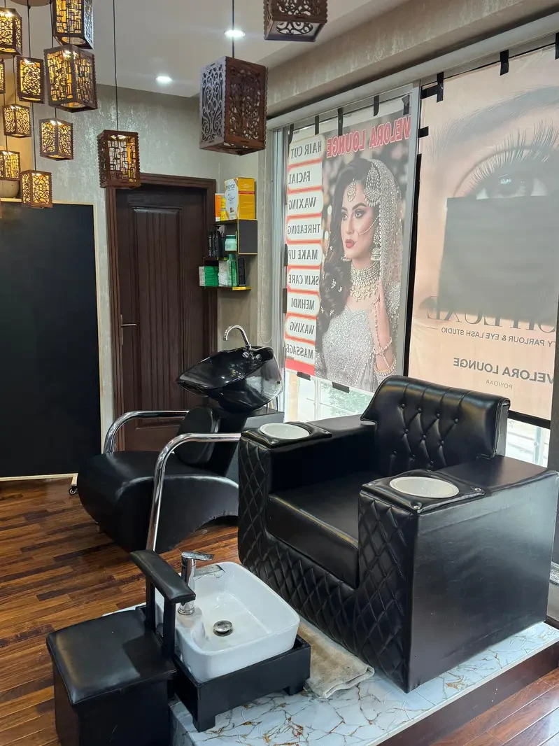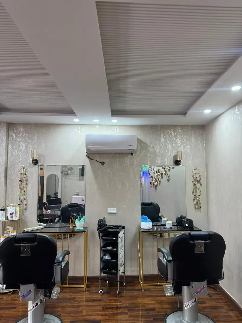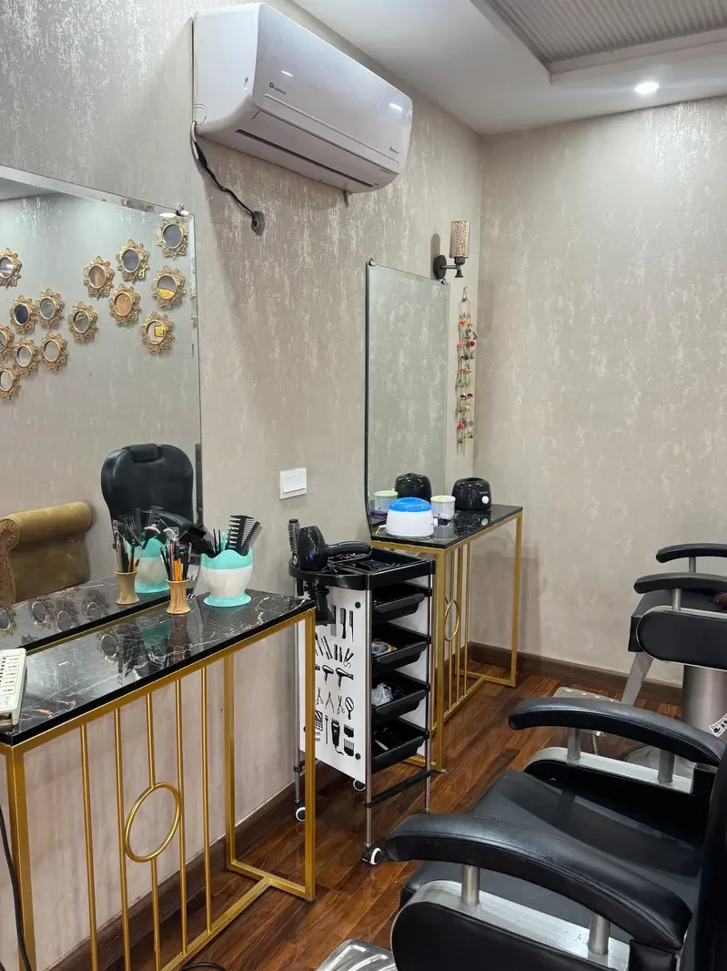 Ladies beauty salon business for sale in Bahria Town – Sector C, Lahore, featuring a fully furnished and operational setup with essential accessories and units for mani‑pedi, hair styling and basic salon services, including multiple chairs, reception area, internet connection, LED TV, and installed AC and geyser.