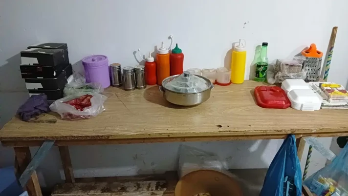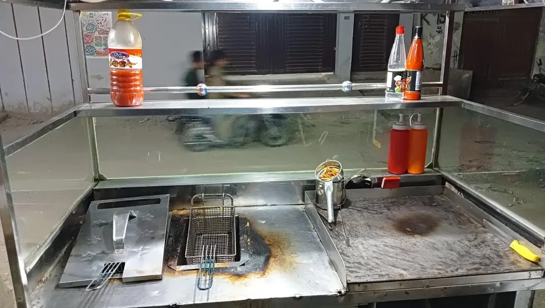 The package includes two working tables, a deep fryer for fries, fryer baskets and tools, a refrigerator, sauce bottles, toppings containers, burger packing boxes, a grater, utensils, and other small accessories, along with fries preparation equipment. This ready-to-use setup allows the buyer to start their fast food business without additional investment.