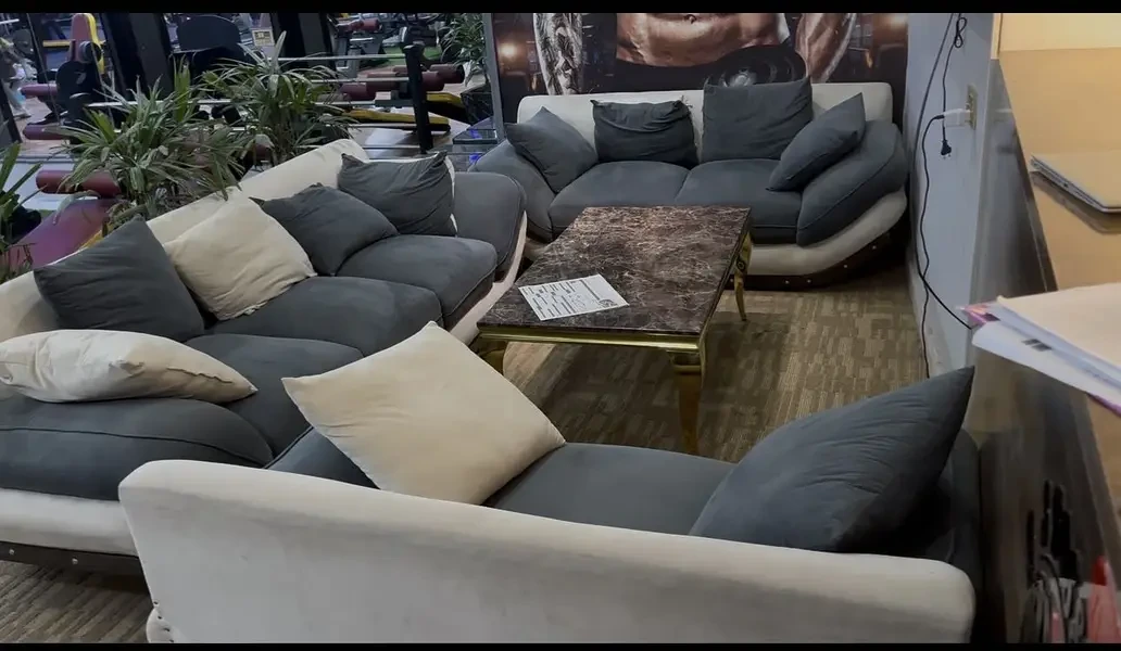 A complete 6-camera surveillance system with night vision, LCD screens, lockers, sofa seating, and a wooden counter — all in excellent working condition, making it a ready-to-operate fitness business opportunity priced at Rs 1.20 Crore.