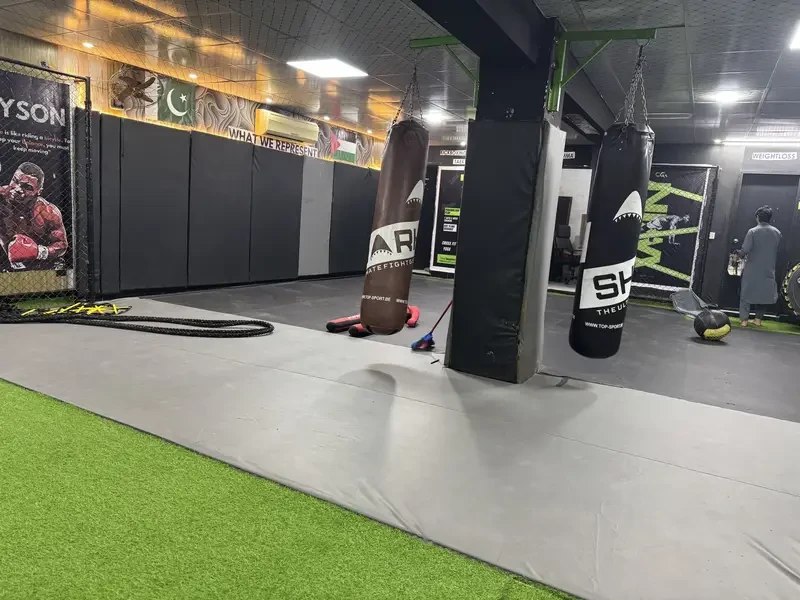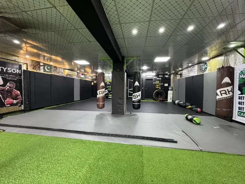 A fully equipped MMA Gym is available for sale in Lake City Meadows Phase 1, Lahore. The gym features ground mats, wall padding, boxing bags, dummies, benches, preacher equipment, and other training gear, catering to over 200 clients with 30 active members.