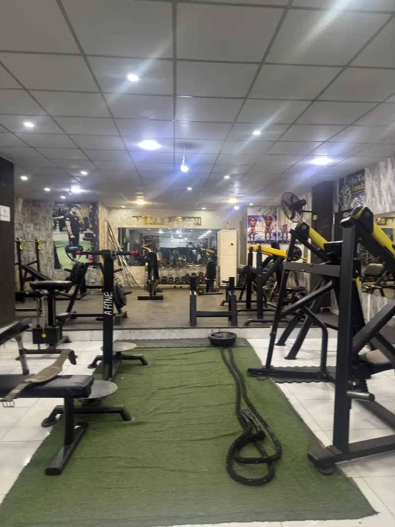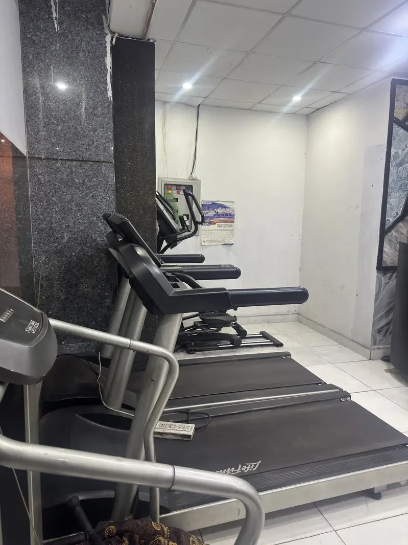 A fully equipped gym is available for sale in Riwaz Garden, Lahore, spread over 12 marla with one washroom and a changing room. The gym comes with a complete range of fitness equipment including 2 treadmills, 1 elliptical, 1 massager, 2 cycles, cross-over machine, four-station setup, butterfly machine, lower back, biceps curl, triceps press, hugout bar, crunches machine, leg extension, wings, Smith machine, calves machine, leg press, chest press, T-bar, forearms machine, shoulder press, biceps manual curl, straight and incline bench press.
