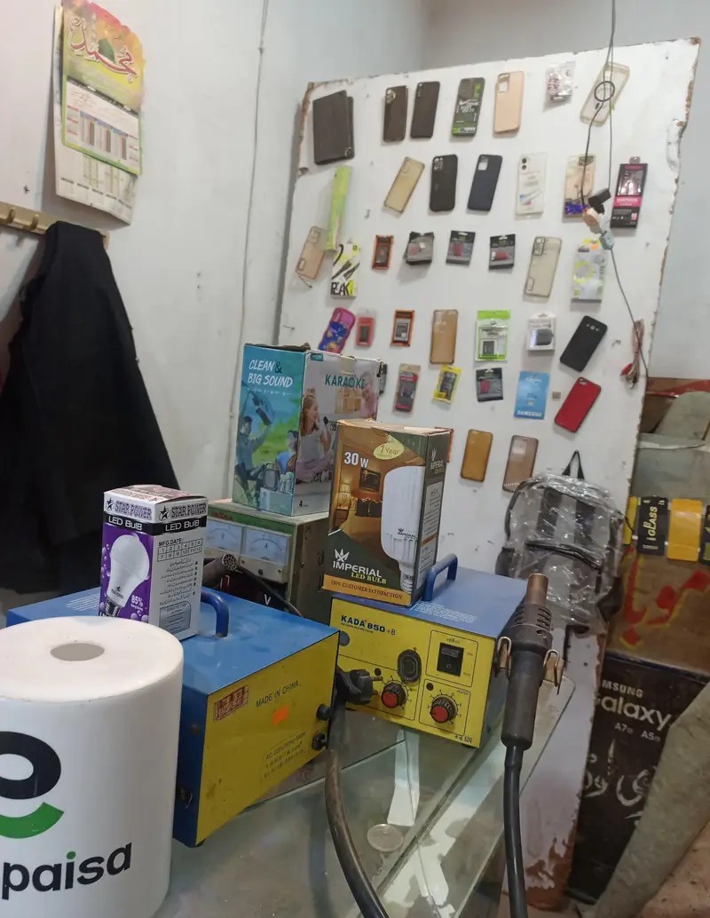 A fully operational mobile phone and computer accessories shop is available for sale in Sheikh Colony, Faisalabad. The shop is strategically located on a main road, ensuring high customer traffic. It comes with 5 counters, a computer with LCD for data management, and all necessary repair equipment including supply machines, heat machines, and kaavia.