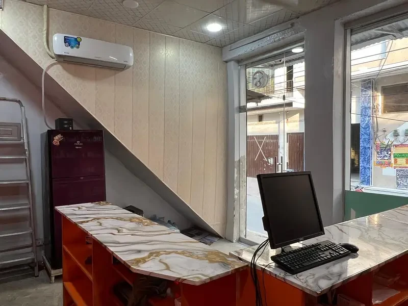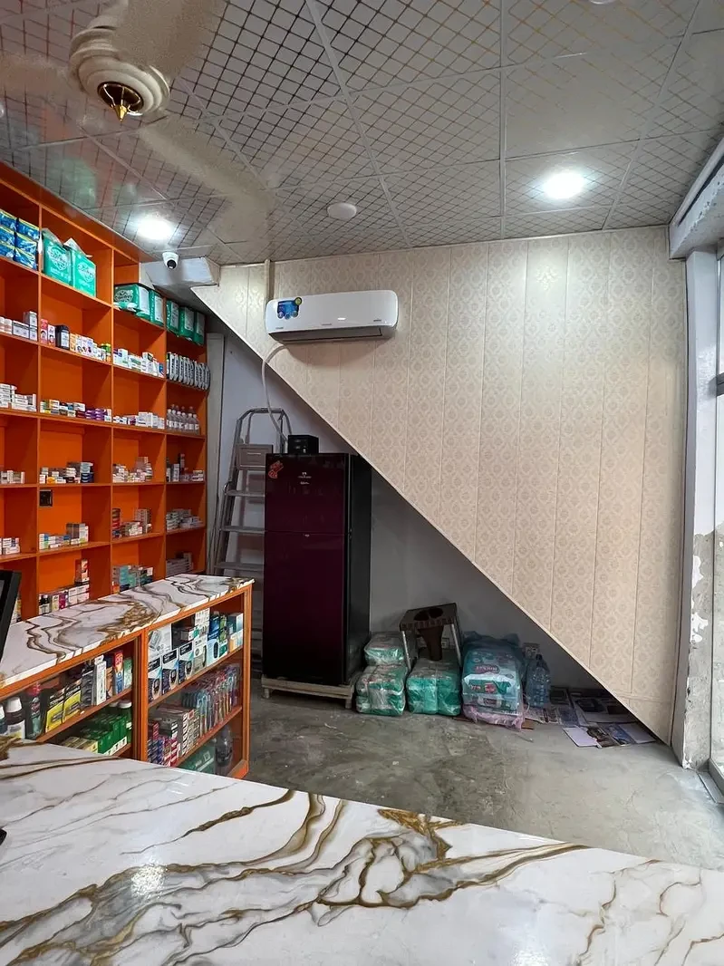 Additional facilities include installed CCTV cameras for security, air conditioner and refrigerator, along with complete lighting, fans, and UPS wiring. The shop features a full glass front with a main glass door entrance, complemented by modern interior paneling and ceiling work, creating a professional and appealing environment. Ideal for anyone looking to invest in a running and well-maintained pharmacy business.
