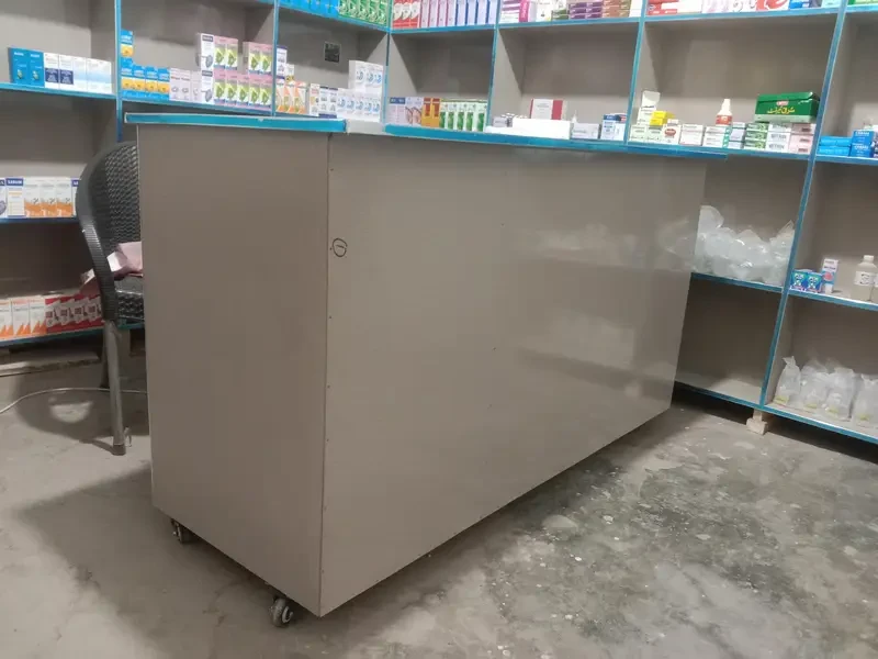 Brand-new laminated pharmacy furniture set for sale — includes two display shelves (8 ft × 8 ft each), one laminated counter table (5 ft × 3 ft) and afront glass + lamination display frame (9 ft × 9 ft), all made from strong materials, fully laminated and in excellent condition. Ideal for a medical store, pharmacy, karyana or general store. Located in Bandi Market, Hattar Industrial Estate (Haripur). Urgent sale. Price: PKR 130,000 (all items).