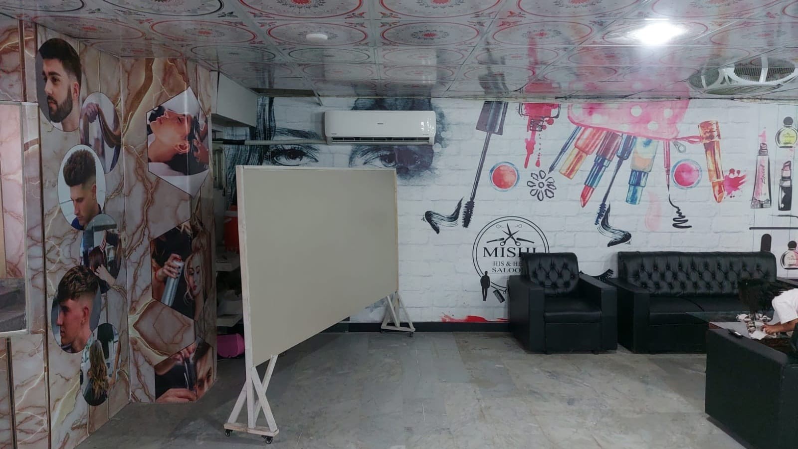 Furnished Beauty Saloon for Sale with Proper Celling and Manail on walls . This Saloon has 1500 Sqft Big Hall with Equipments . In this Beauty Saloon , We are Selling 6 Big Chairs , 1 manicure , 1 padi cure with headwash alongwith Sink . There is Facial bed for Customer Too . 2 Sofa Sets and also there is Room we can make with Cardboards alongwith these Facilities .