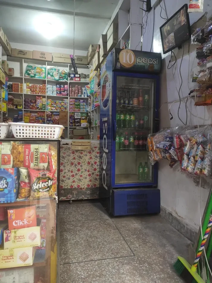 A well-placed running shop for sale on Imam Bara Road, Rawalpindi, offering a ready-to-roll business setup with key fixtures already installed including a Pepsi freezer, Pepsi chiller, wall-mounted ice-cream freezer, WiFi and CCTV—all equipment stays with the business, enabling immediate operation from day one.