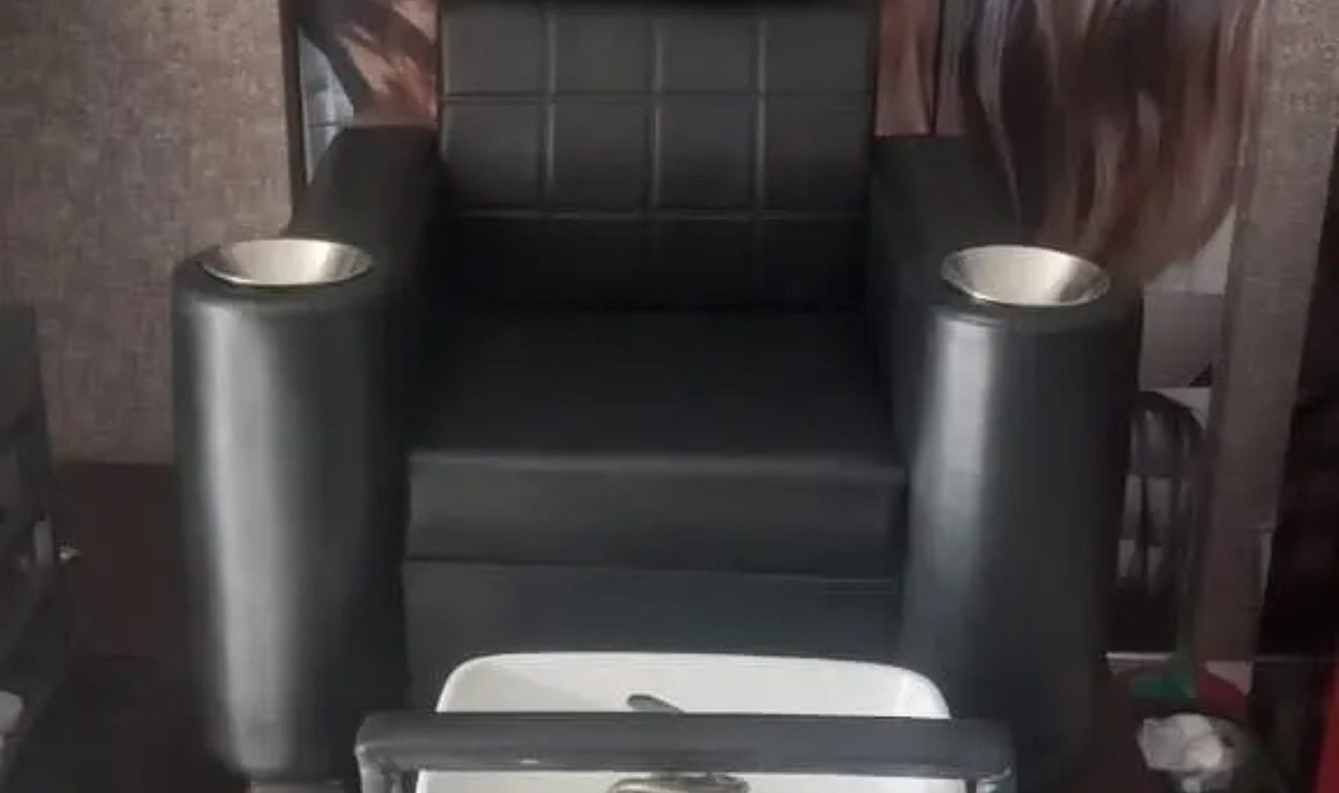 The salon equipment features a mani-pedi + headwash unit, 3 massage beds (2 of them are new), 3 barber chairs with boxes, 2 barber chairs without boxes, 5 large mirrors, 2 counter chairs, 1 round chair, a steamer, a hot towel machine, and a sanitizer machine.