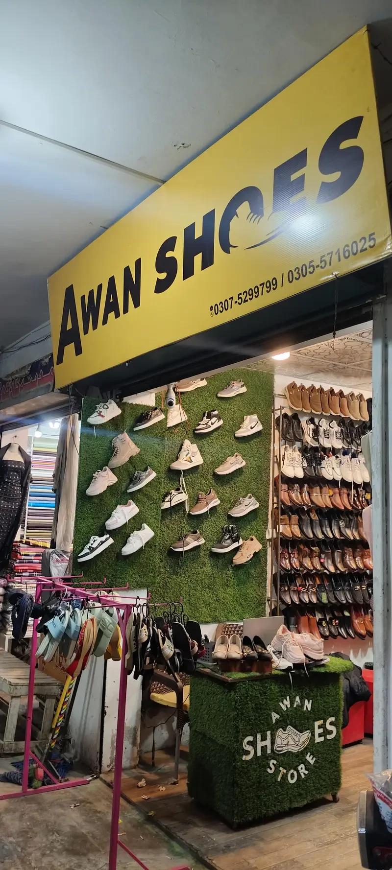 A running shoes store with inventory and storage space available for sale in Nawababad Bazaar, Wah — featuring a stocked shop with a variety of ladies, gents and kids shoes and an on-site god own, making it an immediate business opportunity for a new owner looking to step into an existing retail footwear operation.