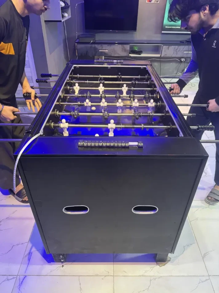 The setup includes 4 brand-new professional snooker tables (6x12) along with multiple entertainment options such as imported foosball, Xbox gaming, and indoor games. The club also has a refill & pod shop and a mini cafeteria, making it a complete entertainment spot.