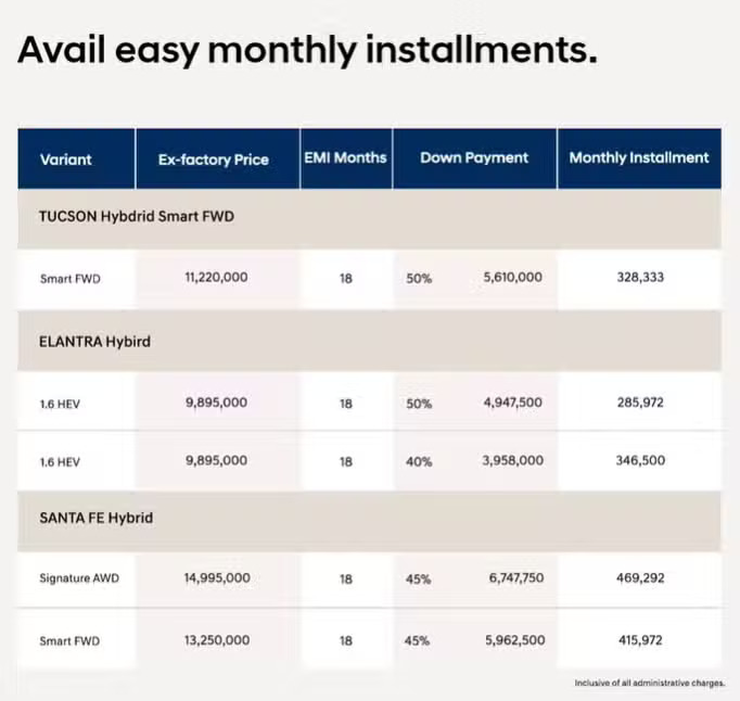 The promotion includes the popular Elantra Hybrid, Tucson Hybrid FWD, and Santa Fe Hybrid. Customers can benefit from low down payments, convenient EMI (Easy Monthly Installment) plans, and an added bonus of one year of free comprehensive insurance.