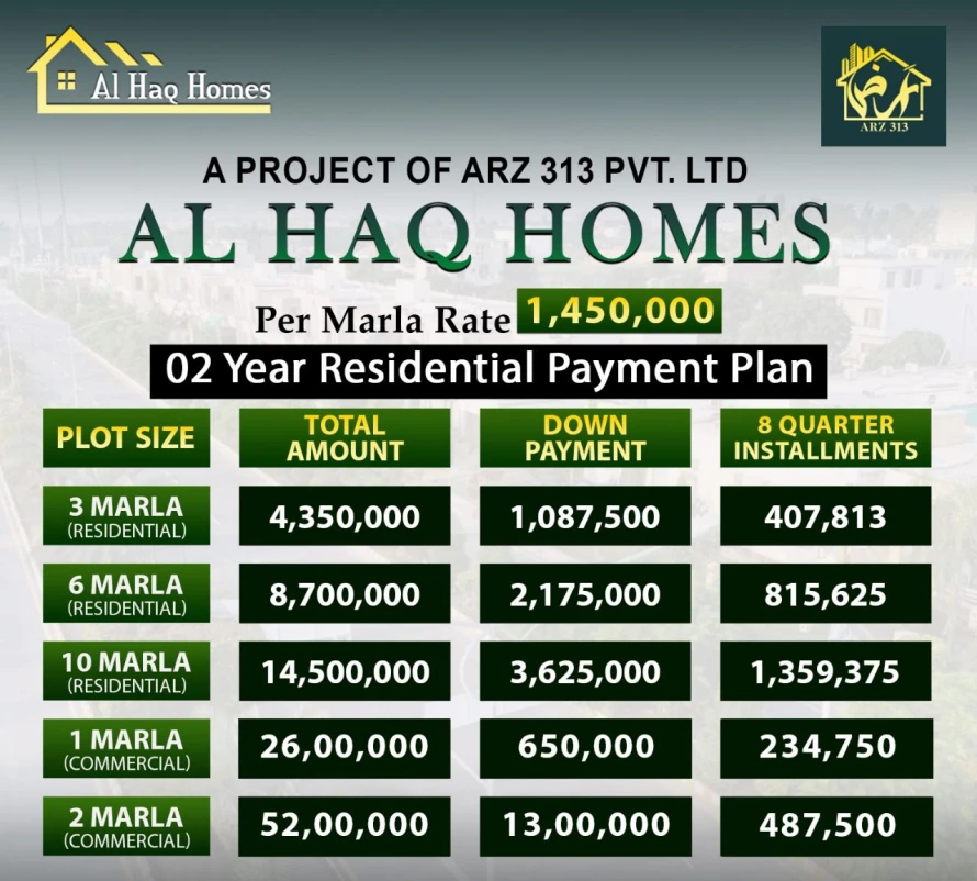 Alhaq Homes is a premium and fully developed residential community by ARZ313 (Pvt) Ltd, a trusted and reputable name in the real estate sector. Offering 3, 6, and 10 Marla residential plots along with 1 and 2 Marla commercial plots, the project provides flexible 2-year easy installment plans, making it an ideal choice for both investors and families. Strategically located on Main Samundari Road, Faisalabad, the society has already proven to be a highly profitable venture, and now only a few plots remain for sale at affordable rates.