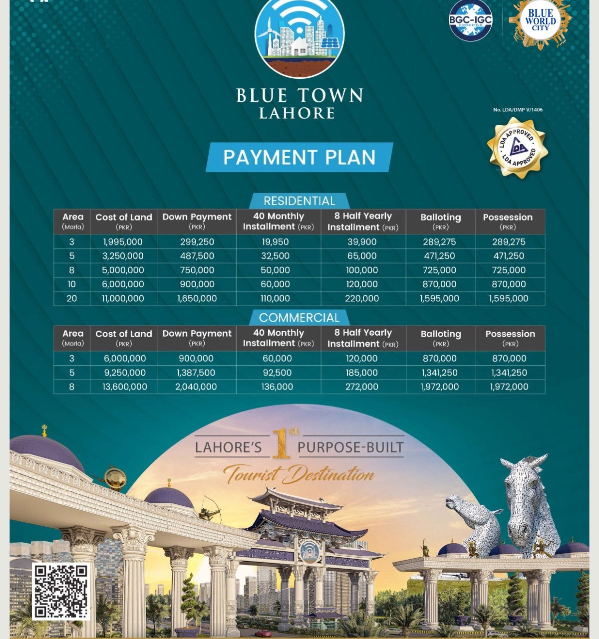 It features iconic tourist attractions such as the Burj Al Arab replica, Blue Mosque, Rumi’s Square, the world’s tallest horse mascots, and Pakistan’s first theme-based water park, all aimed at promoting tourism and elevating community living. Continuing its vision of futuristic development, the consortium has launched Blue Town with Smart City Features—an LDA-approved project with Canal Road access that offers a premium, technology-driven lifestyle.