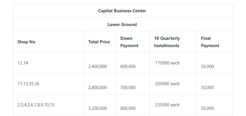 Designed with contemporary architecture and smart space planning, Capital Business Center stands out as one of Islamabad’s top commercial developments. Its prime location, combined with high-quality construction and advanced facilities, ensures strong business potential and long-term investment value. Units are available on cash payment as well as easy installment plans of up to 2.5 years, providing flexibility to buyers.
