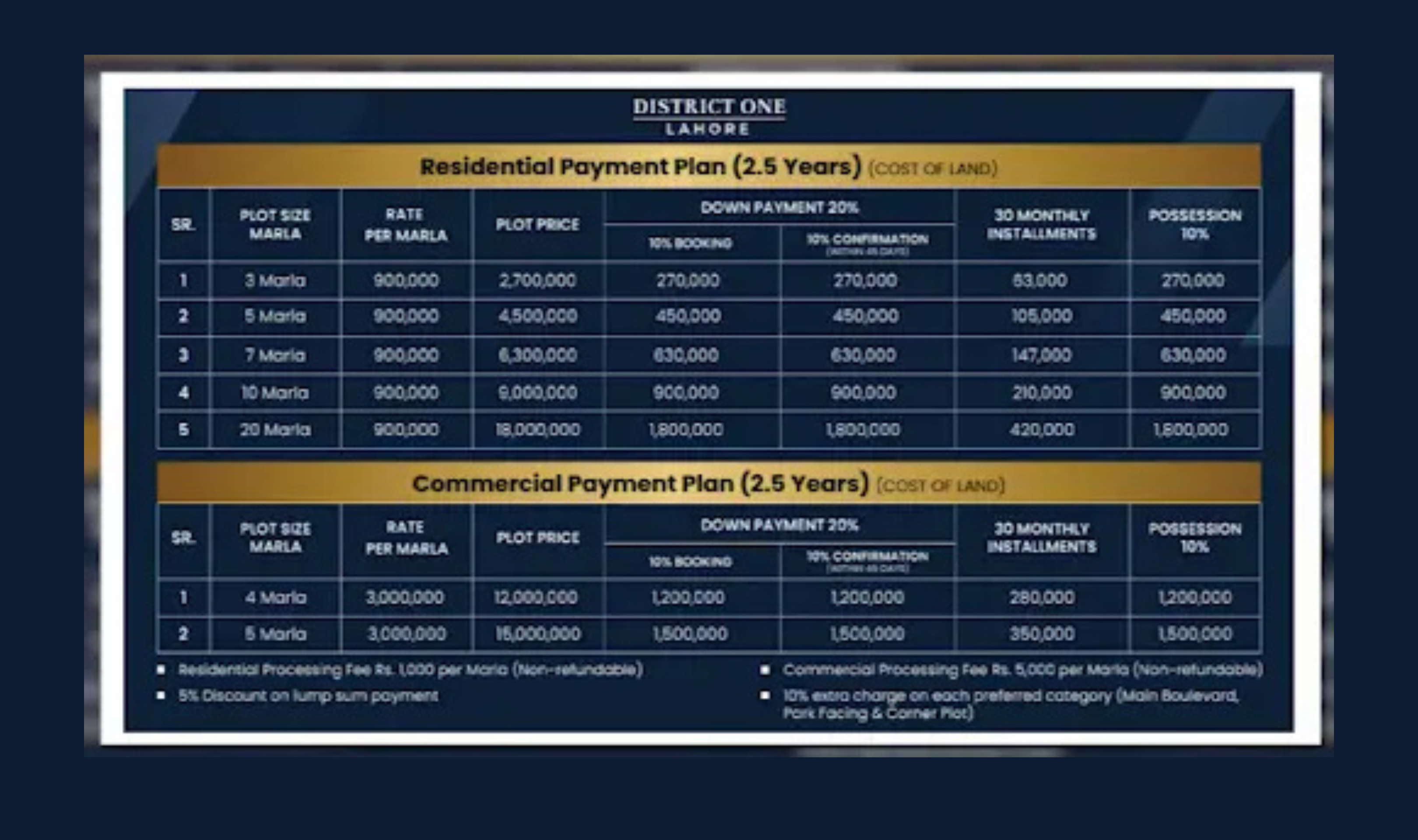 Plots are available on a convenient 2.5-year installment plan, while possession is granted within just 1 year, making it an excellent opportunity for both homeowners and investors. As an LDA-approved housing scheme, District One ensures safe, secure, and transparent investment options.