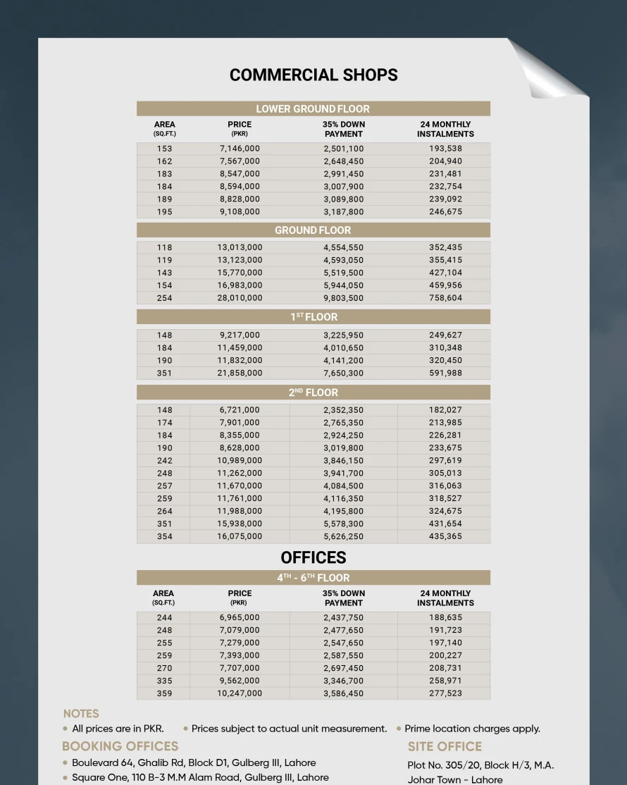 Approved by the Lahore Development Authority (LDA) and registered under Section 100D of the Income Tax Ordinance, the project provides a secure investment opportunity. Its prime location ensures proximity to major landmarks, including Expo Centre, Emporium Mall, Doctors Hospital, and the University of the Punjab, while being near Lahore’s Financial Business District.