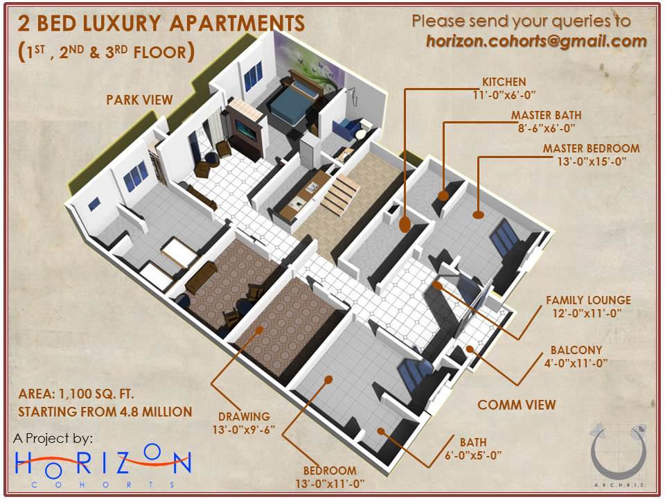 Horizon One offers 2-bedroom luxury apartments spread over 1020 square feet, comprising an attached bath, drawing room, TV lounge, and a modern kitchen with both conventional and American layouts. Overall, Horizon One stands out as a refined lifestyle and investment destination, combining elegance, functionality, and value in one exceptional development.