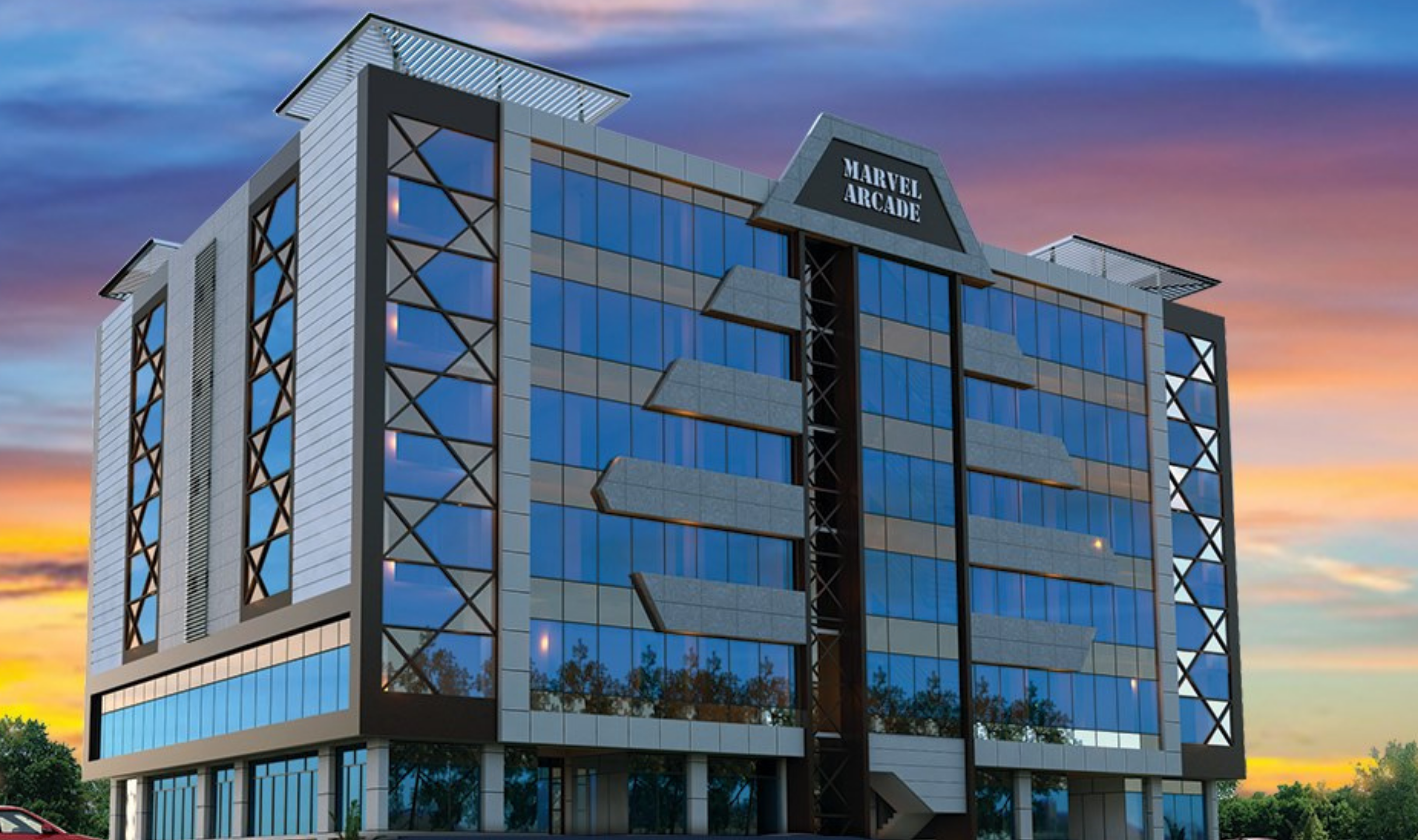 Marvel Arcade occupies a prominent position on Boulevard Road in the Civic Center of Gulberg Greens. This seven-story architectural landmark is highly visible from Islamabad Expressway. The four-sided open design ensures maximum visibility and presence, while the serene surroundings enhance the overall appeal for visitors and tenants alike.