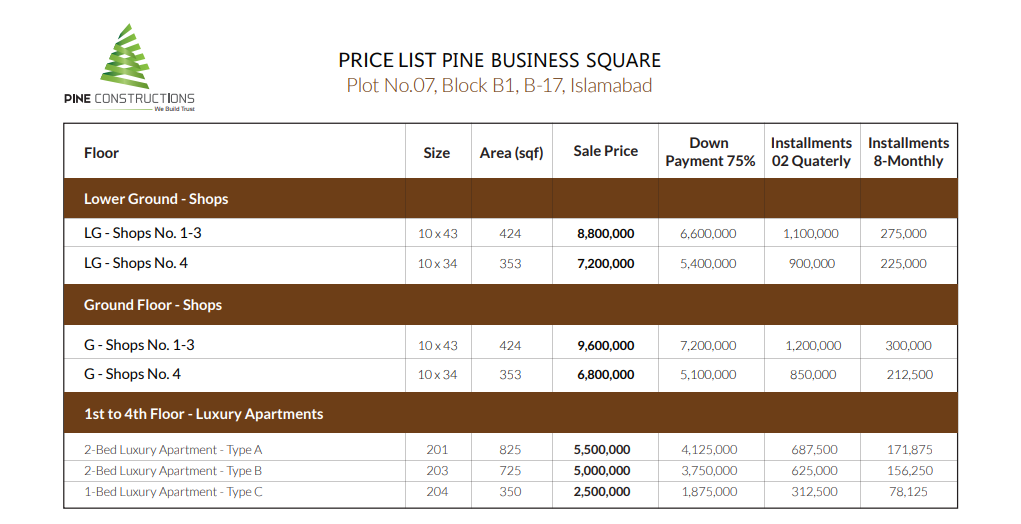 Pine Business Square is a premium mixed-use development by Pine Constructions Company, a name trusted for delivering innovative and smart projects across Bahria Town and Islamabad CDA sectors. This flagship project is ideally located in the most scenic and rapidly developing area of Capital Hills B-17, Islamabad, offering both investment security and modern lifestyle convenience.