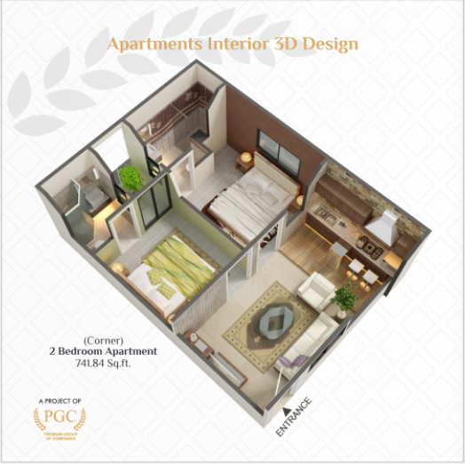 Premium Square offers thoughtfully designed two-bedroom apartments featuring spacious master bedrooms, modern kitchens, and private bathrooms, reflecting elegance and luxury. Kitchen layouts vary to suit different preferences, with open kitchens in corner apartments and private enclosed kitchens in others.