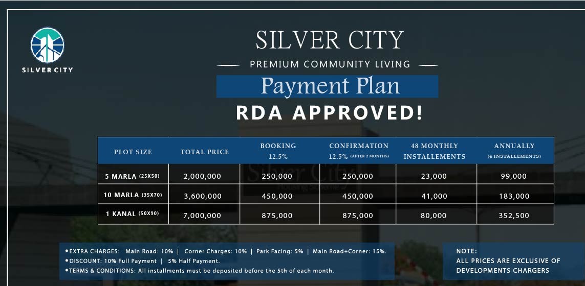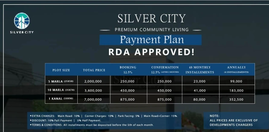 Silver City stands as a fully RDA-approved housing society, backed by complete legal transparency and all 14 departmental NOC clearances from the Rawalpindi Development Authority. This approval confirms that the project is 100% legal, secure, and developed in accordance with government standards—offering buyers absolute peace of mind.