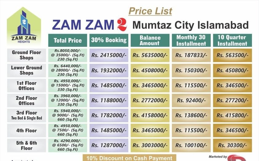 Following the immense success of Zam Zam Heights, Komrat Builders proudly present Zam Zam Heights 2 in Mumtaz City, Islamabad. This mixed-use development is designed to cater to all needs, offering shops, offices, and 1 & 2-bedroom apartments within a single elegant structure.