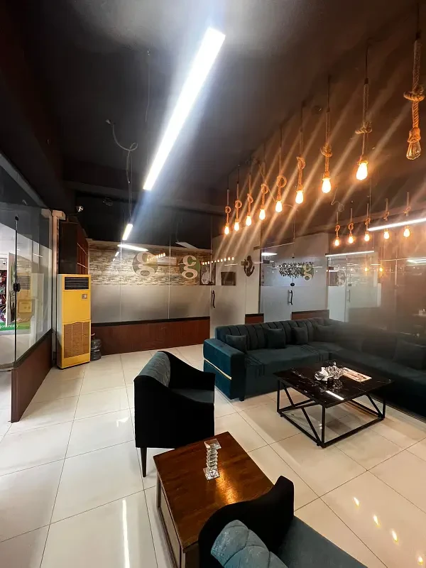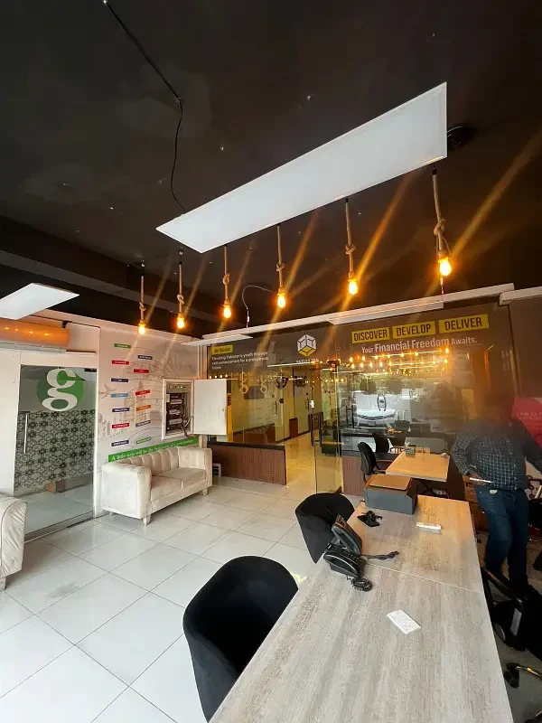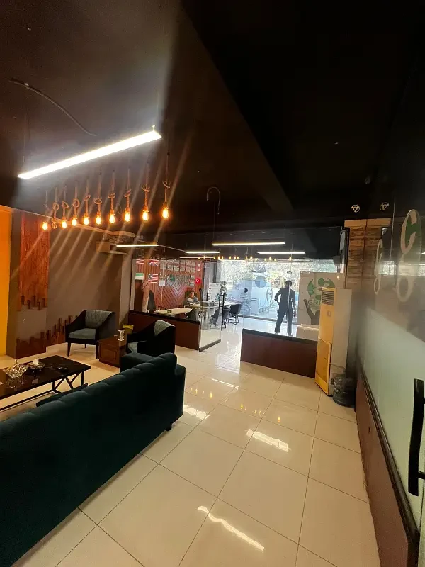 A 1 Kanal commercial building is available for rent at Rs. 10 lac per month, offering 12,000 sq. ft. of space with five large halls, a basement hall, corporate office, and two rooms with attached washrooms.