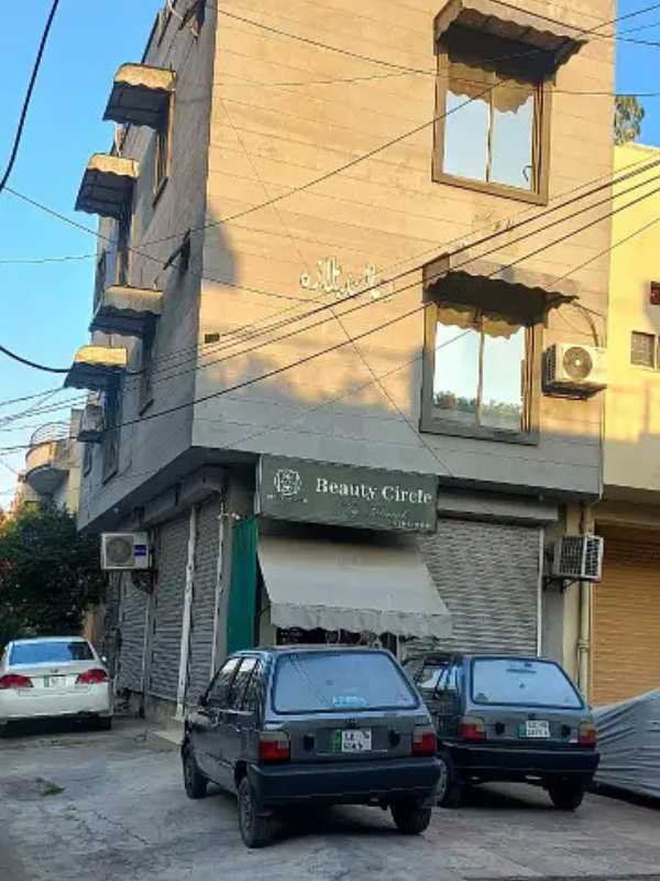 A 50 Sqyd commercial building is for sale in Johar Town, Block G-4, Lahore. It includes a ground-floor hall with attached bath and two 2-bedroom flats on the first and second floors, each with attached baths and kitchens. The building has separate entrances for all units, 3 electricity meters, 2 gas meters, 2 water pumps, 2 water tanks, and huge public parking.