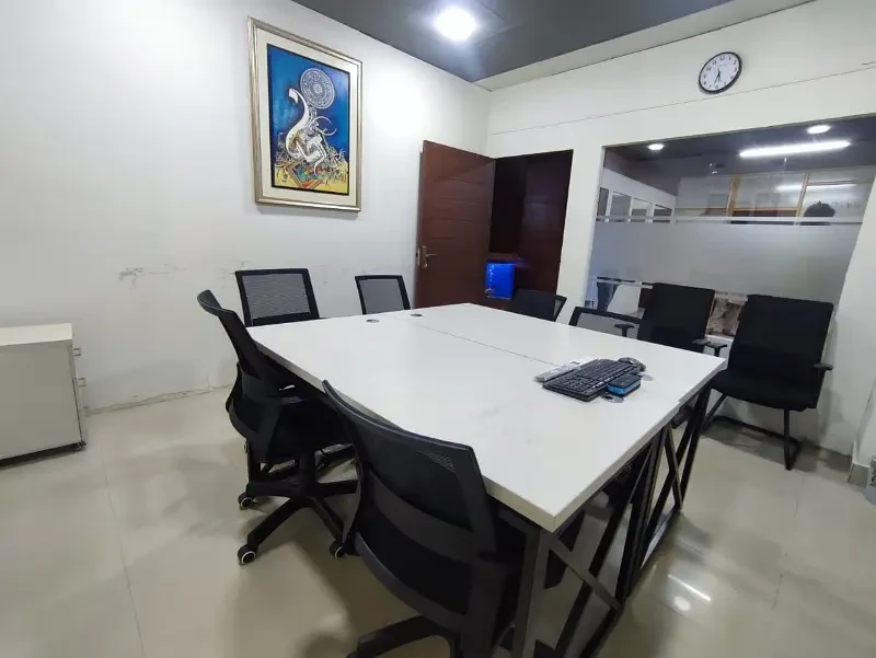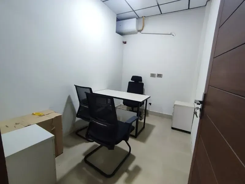 The space includes 1 executive room, 2 manager rooms, a large hall, kitchen, café area, 2 washrooms, tile flooring, and a commercial ceiling. Ready to move in and ideal for offices or commercial use.