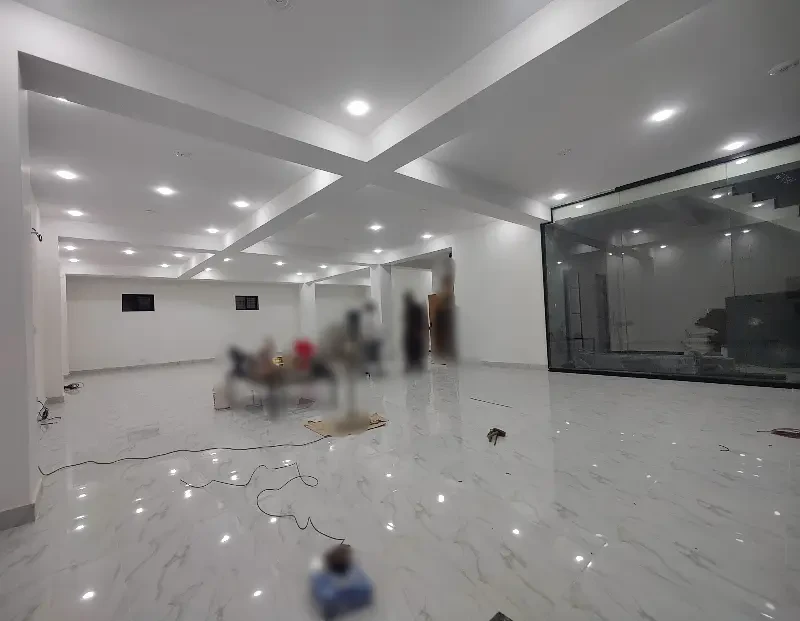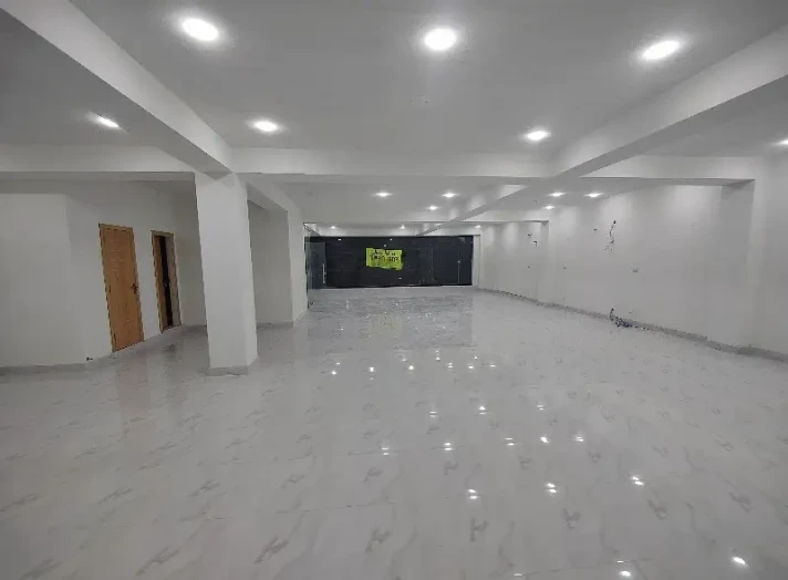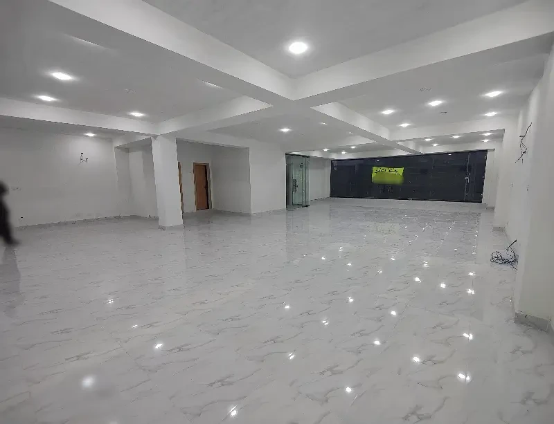 A 9,000 sq. ft. full-length building/hall is available, ideal for software houses, call centers, and corporate offices. Features include separate male and female washrooms, kitchen, wall-mounted AC ducts, full display glass, fresh tiles, lift access, and secured basement parking.