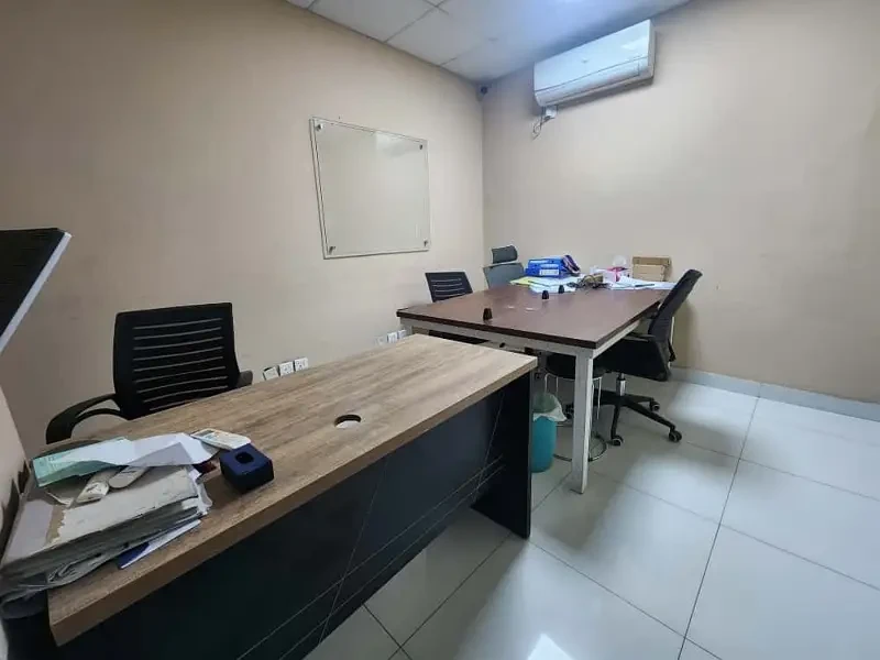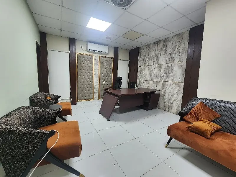 A 1 Kanal ground floor semi-furnished office is available for rent, covering 3,000 sq. ft. It features cabins, halls, three washrooms, and a kitchen. Monthly rent: Rs. 5 Lac.