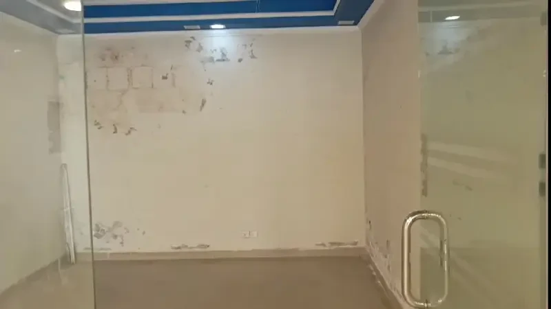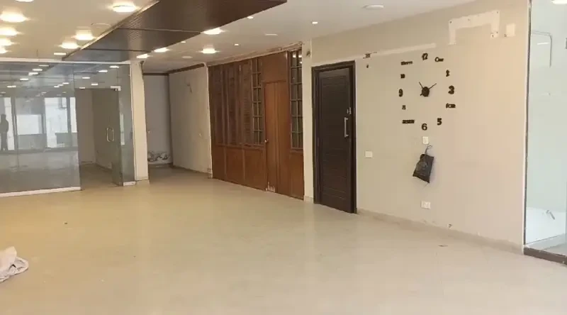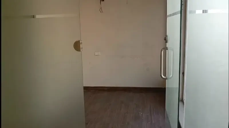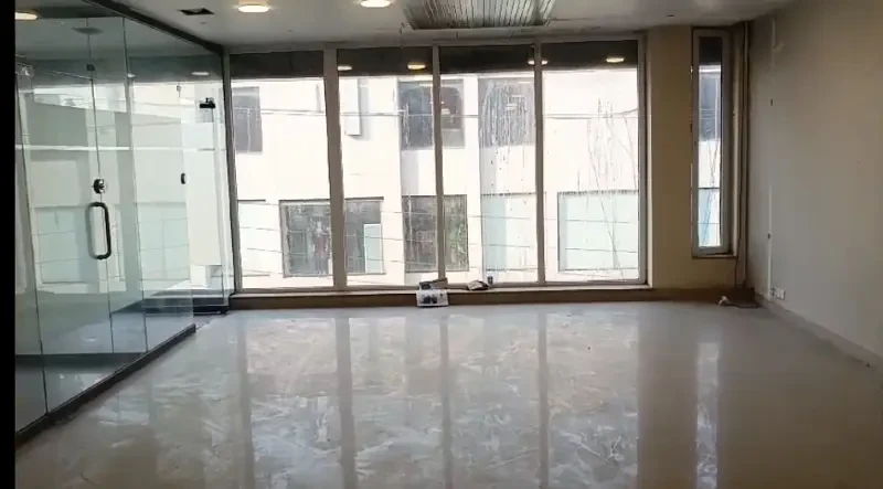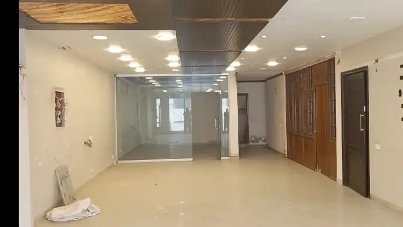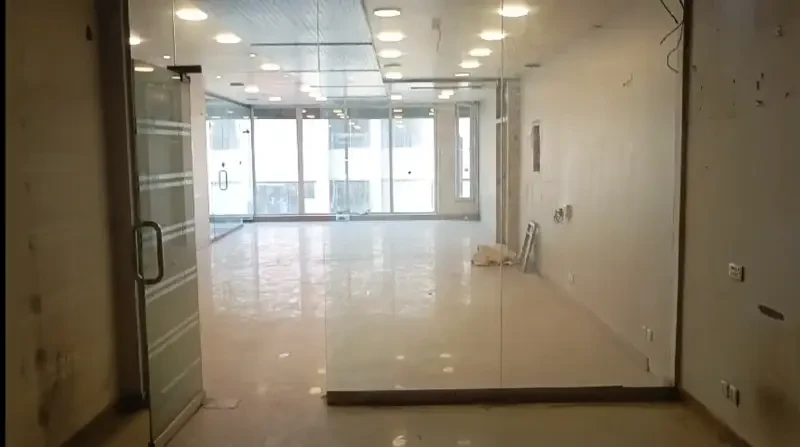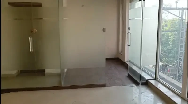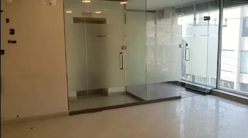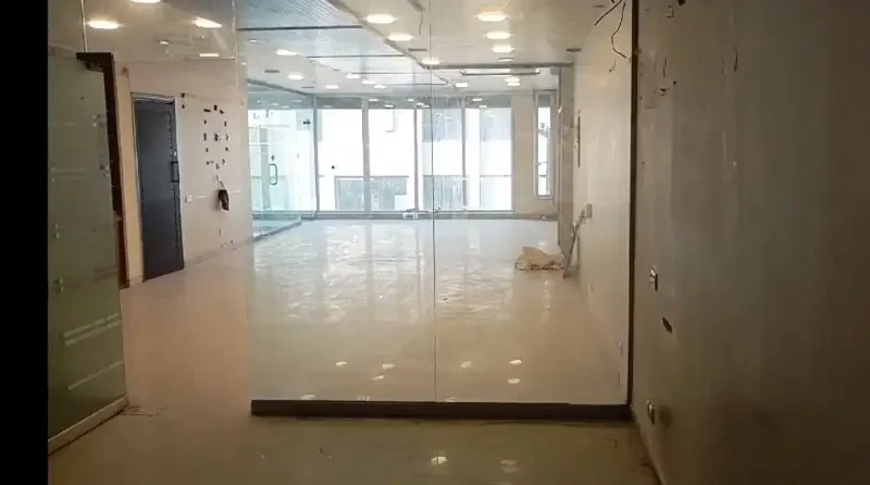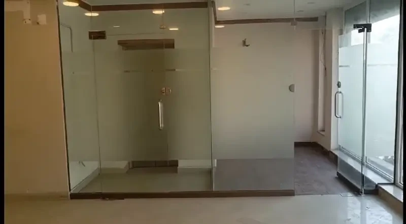 The office includes two glass cabins, a spacious hall, a kitchen, and clean tile and marble flooring throughout. It is positioned facing the parking area, ensuring convenience for staff and visitors.
