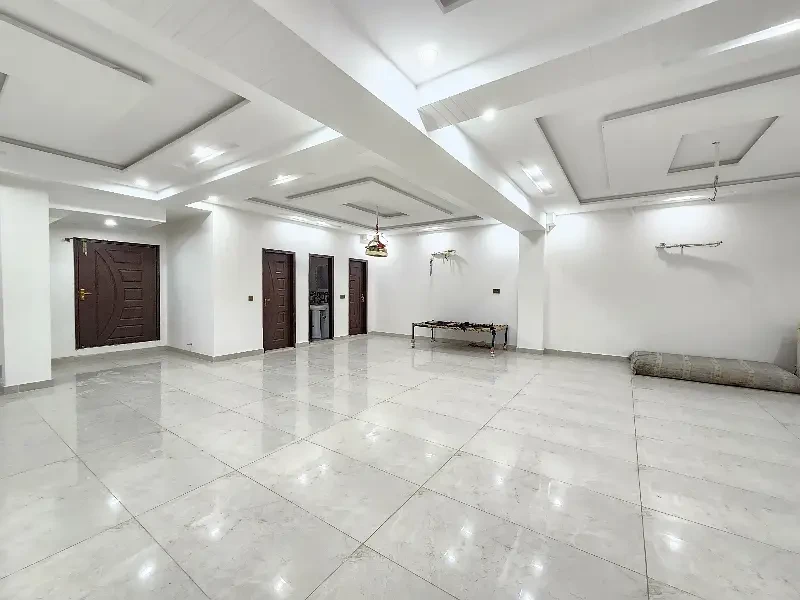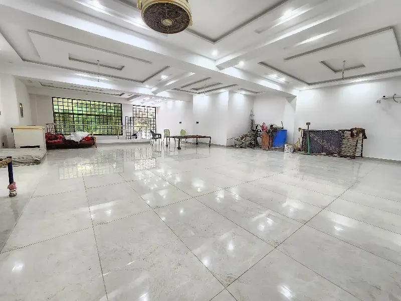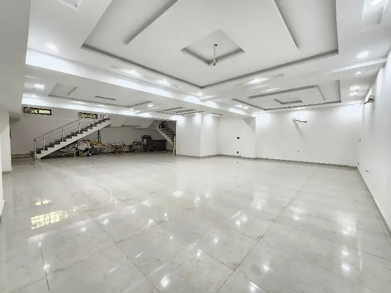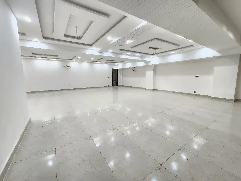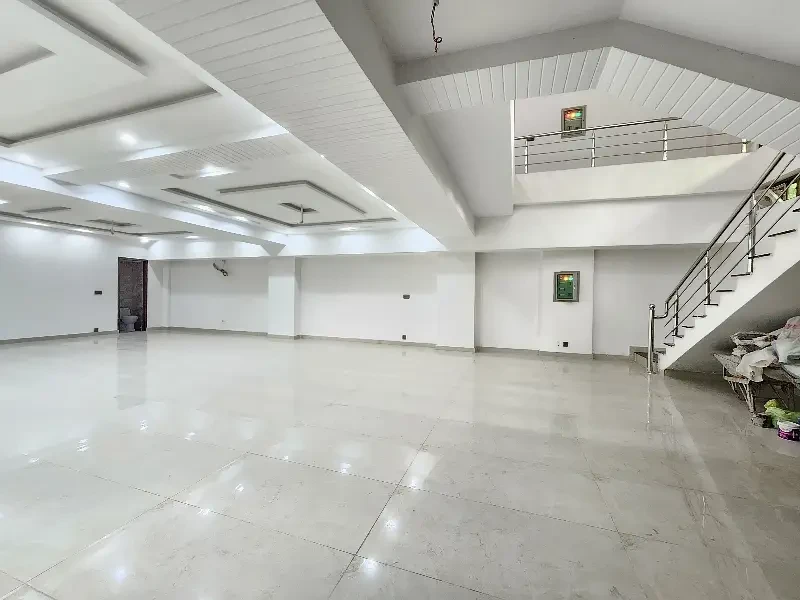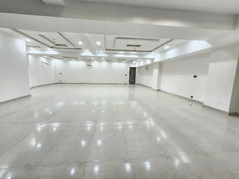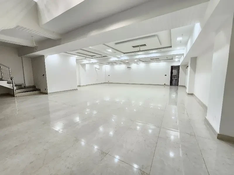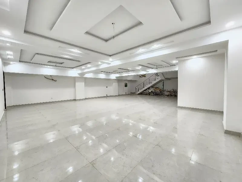 A commercial two-floor hall is available for rent on Main Johar Town near UCP. The ground floor (3.25 Lac) has 2 washrooms, the basement (2 Lac) has 1 washroom, or both floors together for 5.25 Lac. Features include tile flooring, ceiling lights, AC piping, and a kitchen—ideal for offices or commercial use.