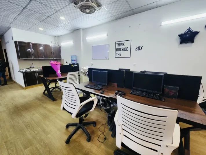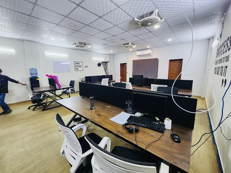 A fully furnished floor is available for rent in Johar Town, offering a beautifully designed office space ready for immediate use. The layout includes one executive room, seating capacity for 18 employees, a kitchen with dispenser, two washrooms, a store area, and a well-lit office ceiling with fans. The space is equipped with air conditioning, tile flooring, and provides a professional working environment.