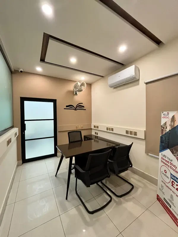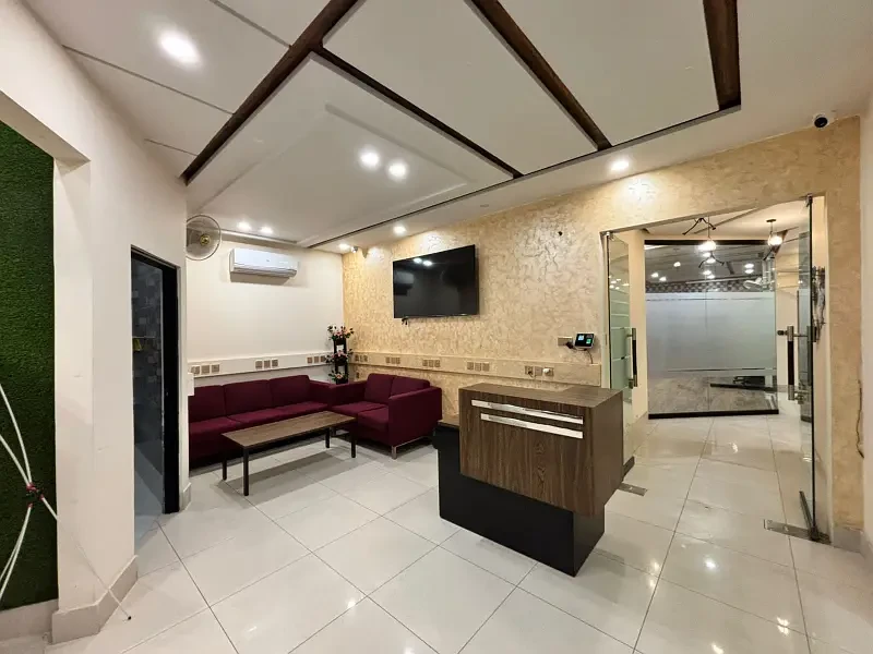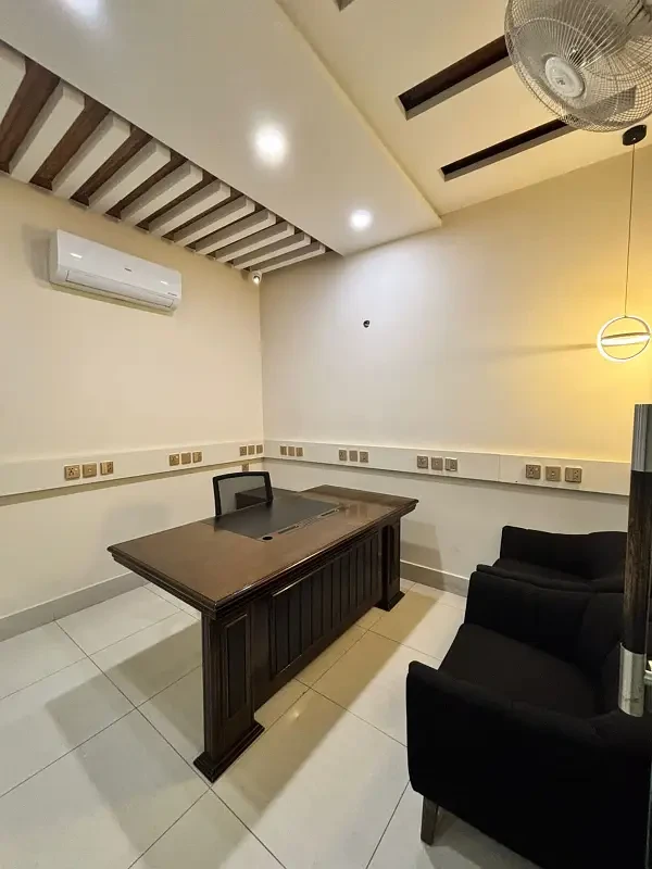 A 2250 sq. ft. fully furnished office is available for rent at Kohinoor City, Faisalabad. The office is ready to move and features tile flooring, false ceiling, modern lighting, installed AC, wall fans, stylish wall interior, furniture, two washrooms, and a kitchen.