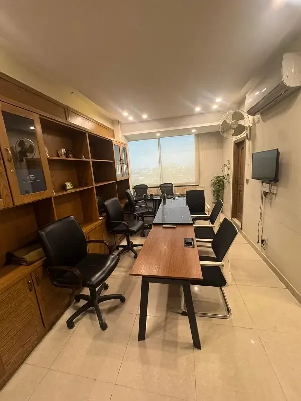 A fully furnished 4,000 sq. ft. corporate office is available for rent on the 2nd floor of Jinnah Avenue, Blue Area, Islamabad, with Margalla Hills views. The office includes 5 executive offices, 80 staff workstations, a meeting room, 4 washrooms, a kitchen, lift access, and high-quality Interwood furniture. Rent is 13 lakh PKR per month.