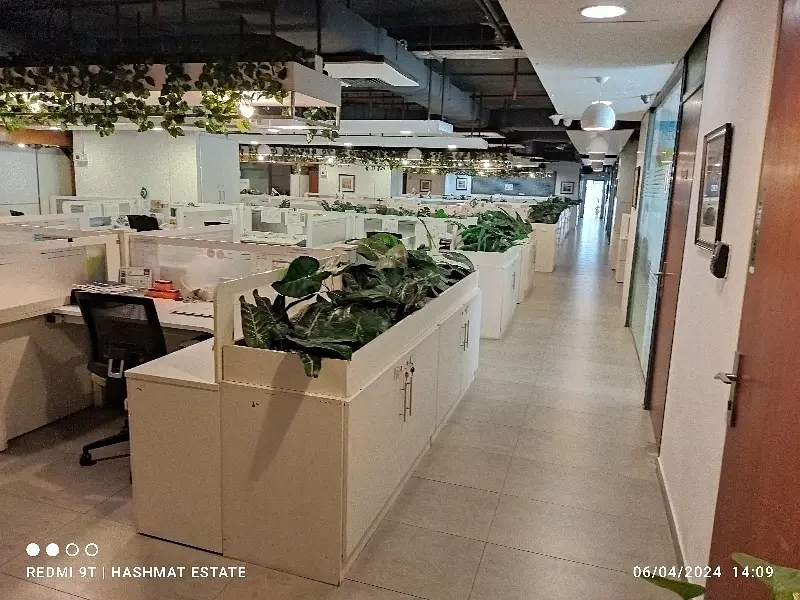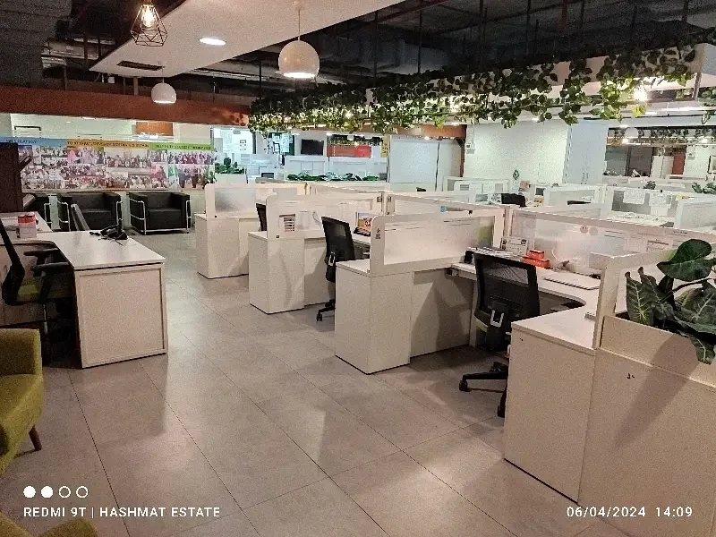 The office interior is designed for efficient workflow and a professional environment. It features wood and glass partitions, multiple manager rooms, three meeting rooms, a board meeting room, an executive chamber, a reception with waiting area, and seating capacity for approximately 100 or more employees.