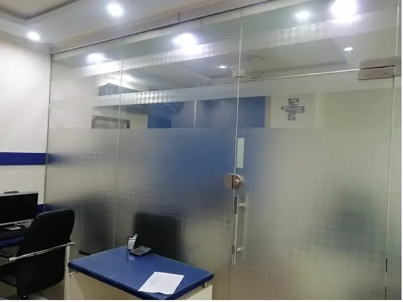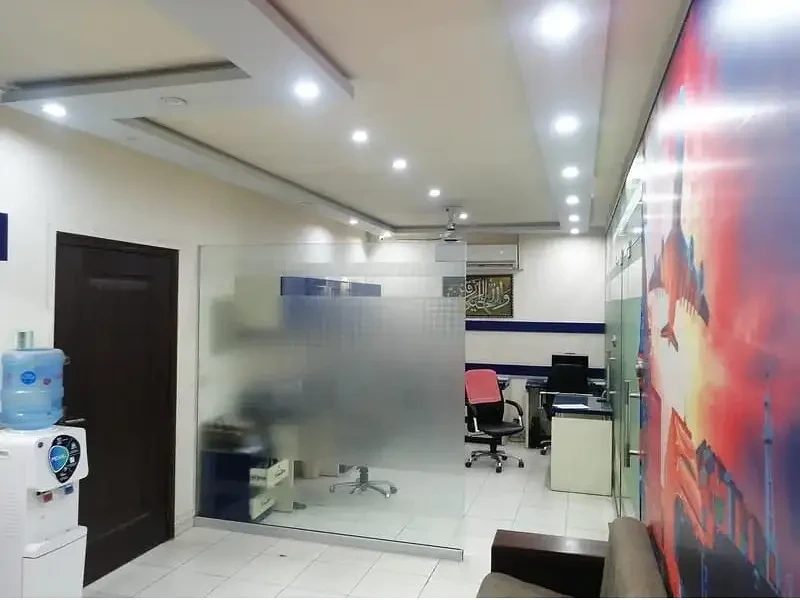 A fully furnished 700 sq. ft. office is available for rent on Main Boulevard Road, Gulberg 3, Lahore. It includes two rooms, a hall with staff seating, a kitchen, and a bathroom, with networking and wiring already installed.