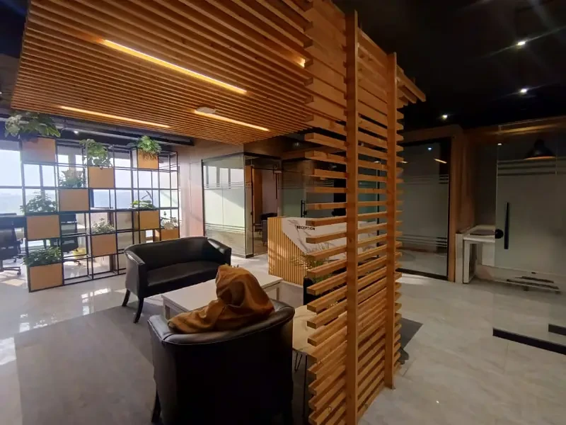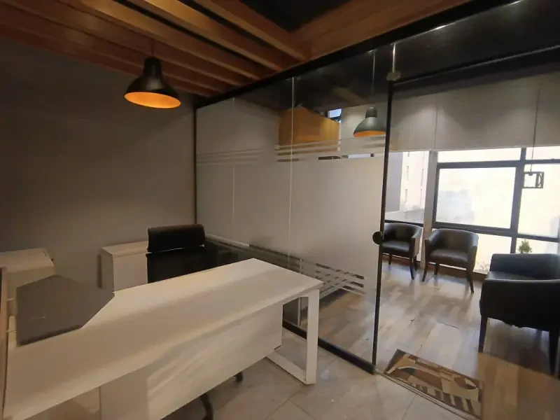 The office includes an executive room, two glass-partitioned rooms, meeting room, reception, workstations, kitchen, and bathroom. Equipped with tile flooring, ceiling lighting, AC, CCTV, and a lift, it offers a modern and secure workspace.