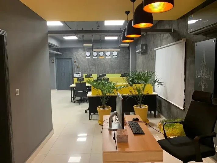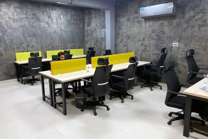 The office features a spacious, fully furnished hall suitable for team setups, an elegant private executive room for focused work, and a dedicated meeting room for client interactions and presentations. It also includes a separate kitchen and bathroom for convenience, along with brand-new tiled flooring, a stylish ceiling design, and beautifully decorated walls that create a refined and professional atmosphere.