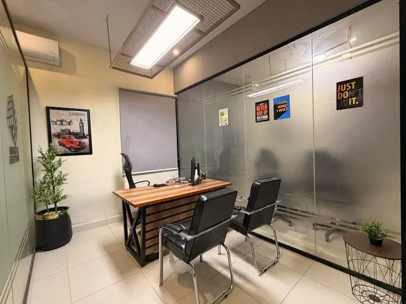 The interior is finished with modern tile flooring, office-grade false ceilings with integrated lighting, and stylish glass partitions that maintain an open yet private environment. High-quality imported furniture and ergonomic chairs are also included, ensuring a ready-to-use setup.