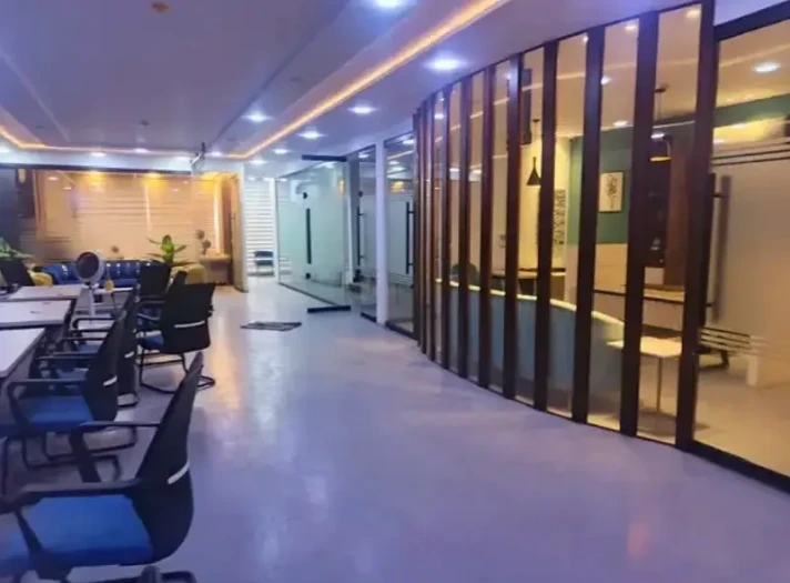 This office features a spacious, fully furnished hall perfect for team setups, along with brand-new tiled flooring that enhances the sleek and contemporary ambiance. It includes a private executive room for focused work and a dedicated meeting room designed for client interactions and presentations.