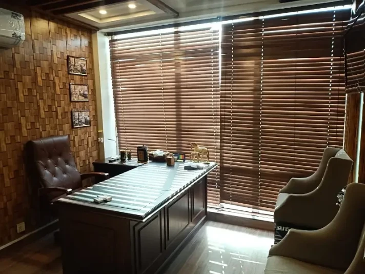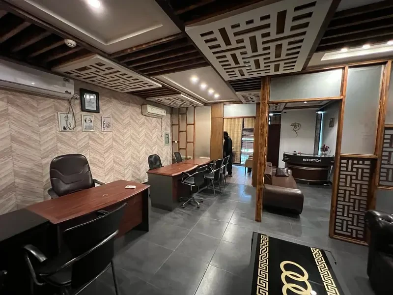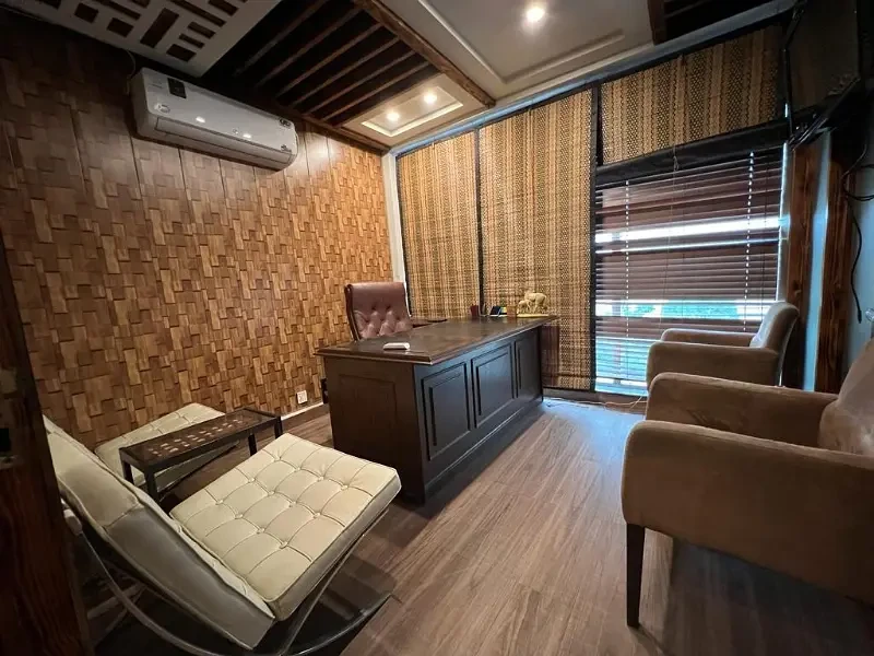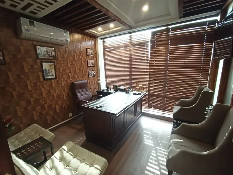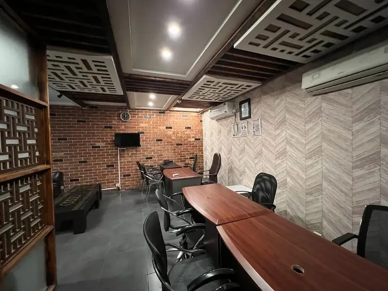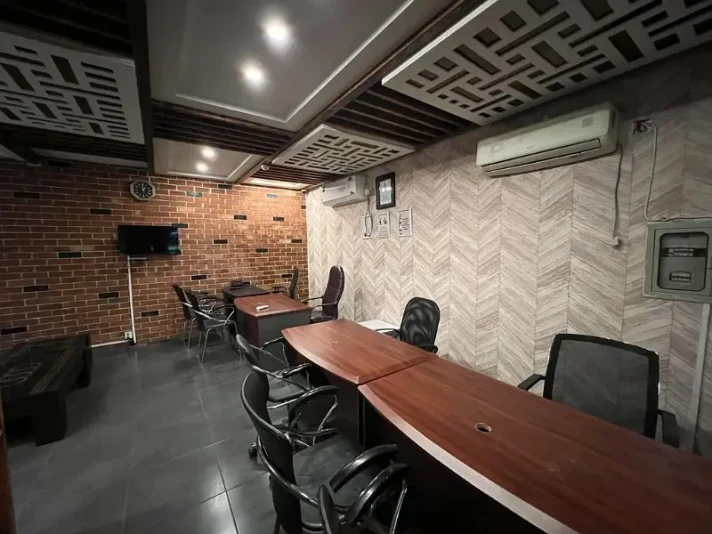 The office includes one executive room and one meeting room, making it suitable for business operations, client meetings, or private workspaces. Additional features include a separate bath and kitchen, ensuring convenience for staff throughout the day. The stylish ceiling and tastefully decorated walls add to the office’s contemporary aesthetic, creating an ideal environment for productivity and comfort.
