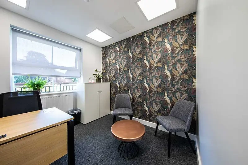 ready-to-use 7 Marla office is available for rent on prime Susan Road, Faisalabad. The property features tiled flooring, installed ceiling, partitions, an attached bathroom, and a kitchen, providing a professional and functional workspace.