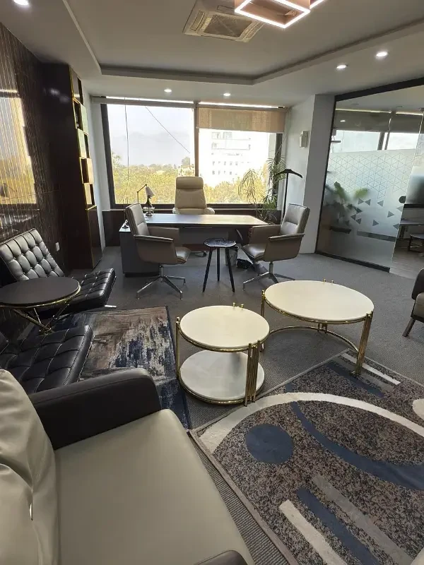 Fully furnished 4,000 sq. ft. corporate office for rent on the 2nd floor of a building on Jinnah Avenue, Blue Area, Islamabad, with Margallah views. The office features 5 executive offices, 1 meeting room, 80 staff spaces, 4 washrooms, and a kitchen, furnished with high-quality Interwood furniture.