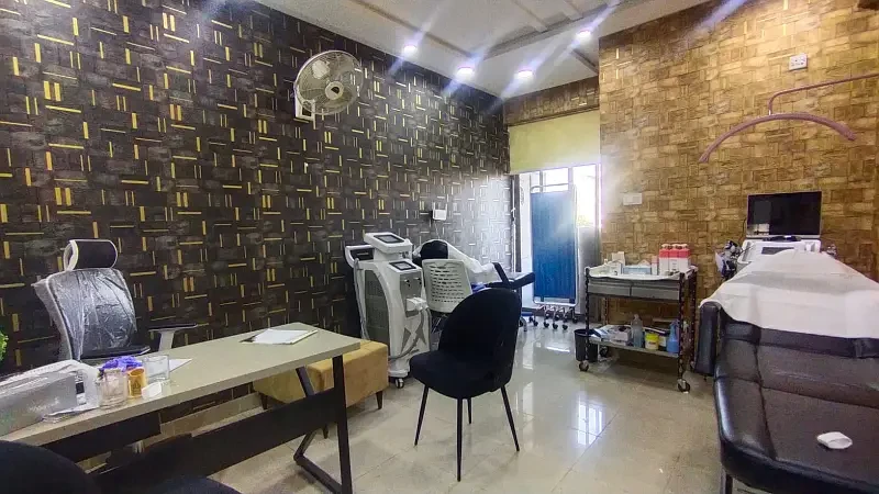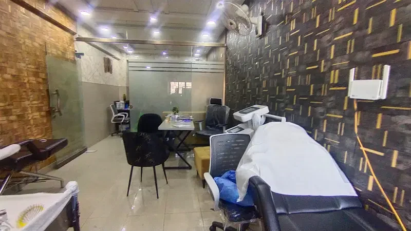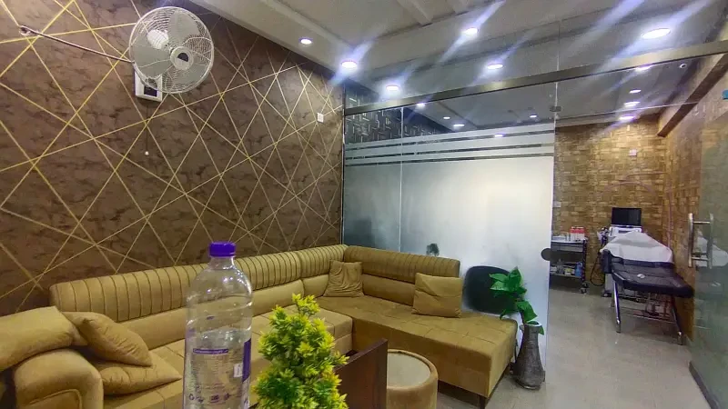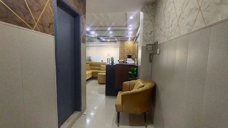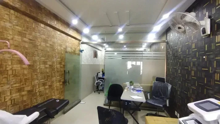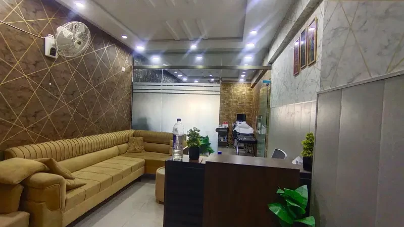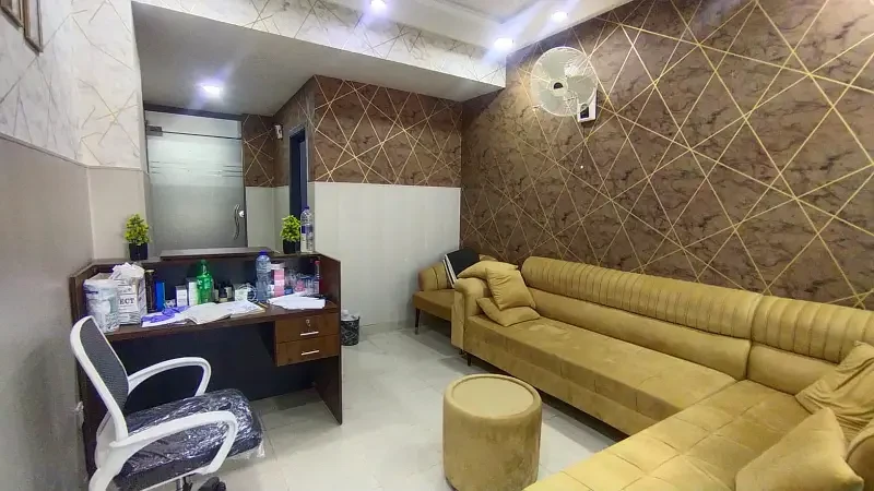 Front-side office in a clean, well-maintained mall on the 1st floor of a lift-equipped plaza. Single unit of 429 sq. ft. (sizes 11–39 sq. ft.) with ceiling, glass partition, bathroom, and kitchen.