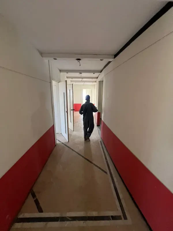 Office for rent on prime Shahra-e-Faisal, offering 4,800 square feet of well-maintained space at Rs 4.59 Lac. The office features tile flooring, false ceiling, built-in chambers, reception area, and a modern glass elevation.