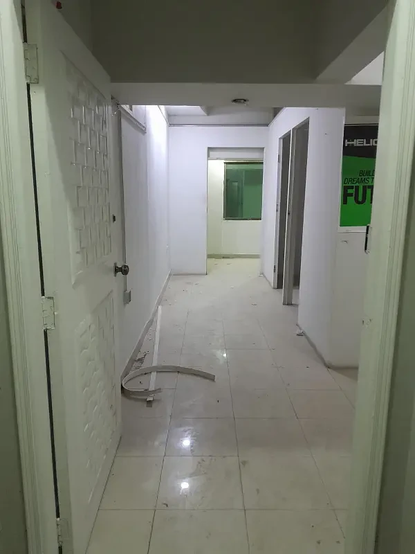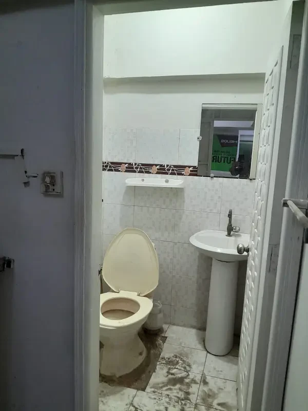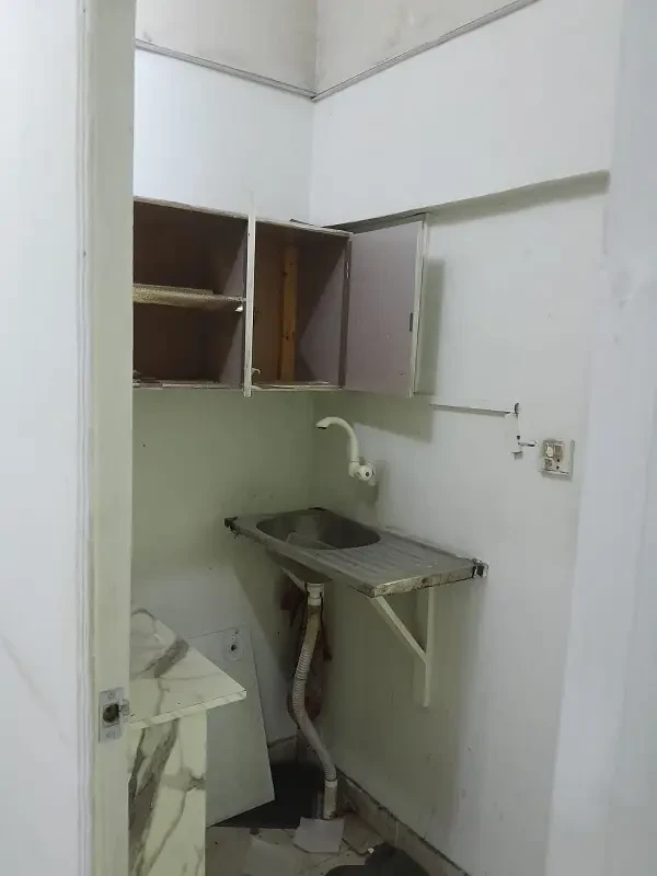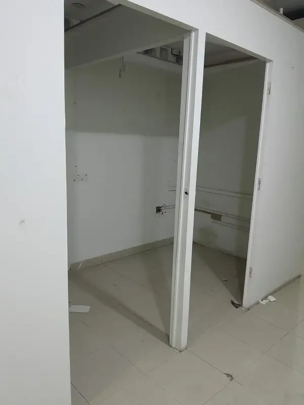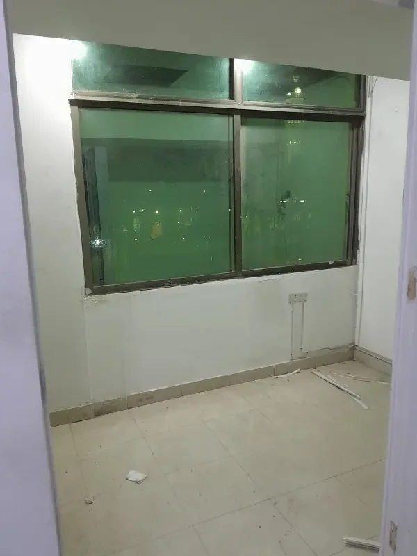 Office for rent in Block 13-B, Gulshan-e-Iqbal, Karachi. The 450 sq. ft. space includes one chamber, one room, a washroom, and tile flooring, with main road frontage.