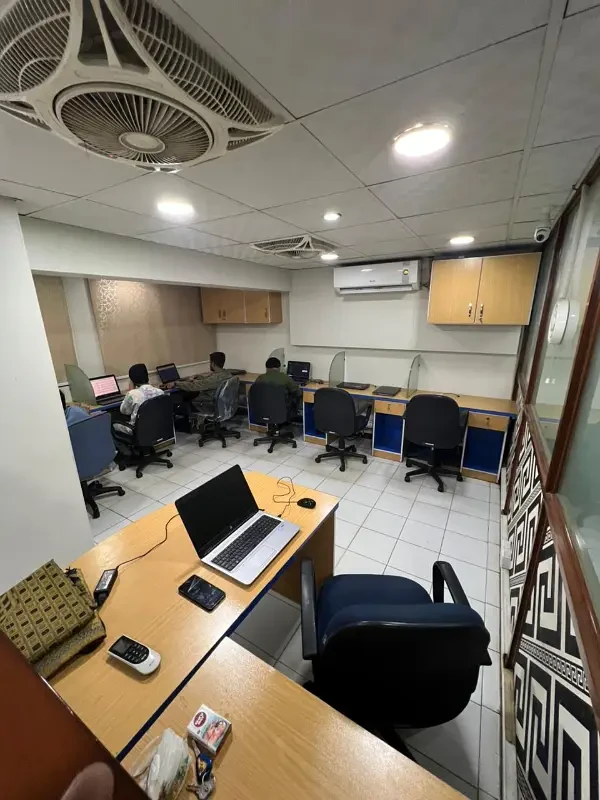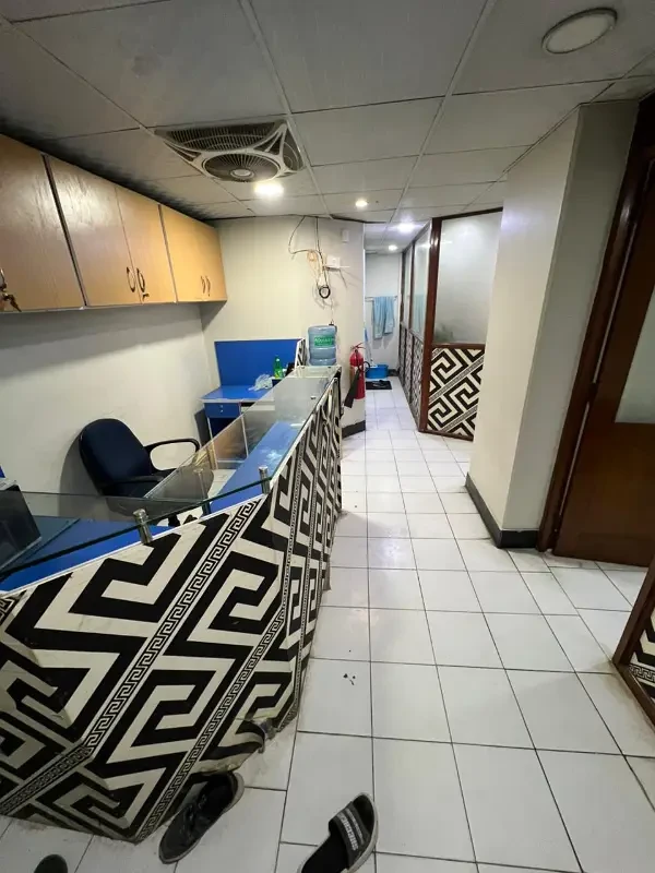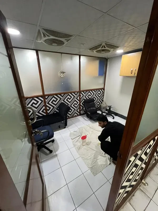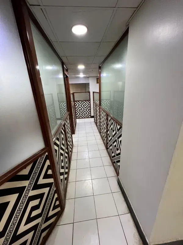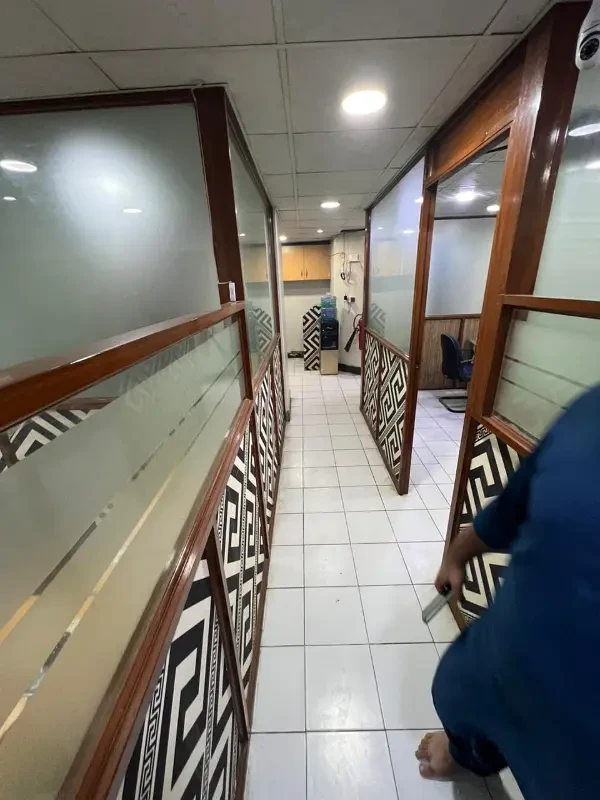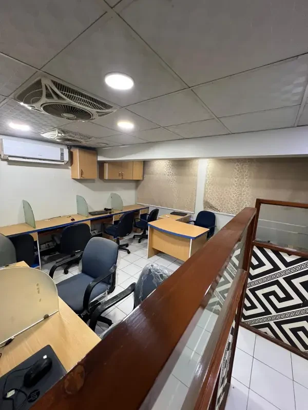Fully furnished office available for rent on Main Shahrah-e-Faisal, featuring an executive room, meeting room, and hall with cubicles.