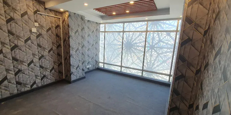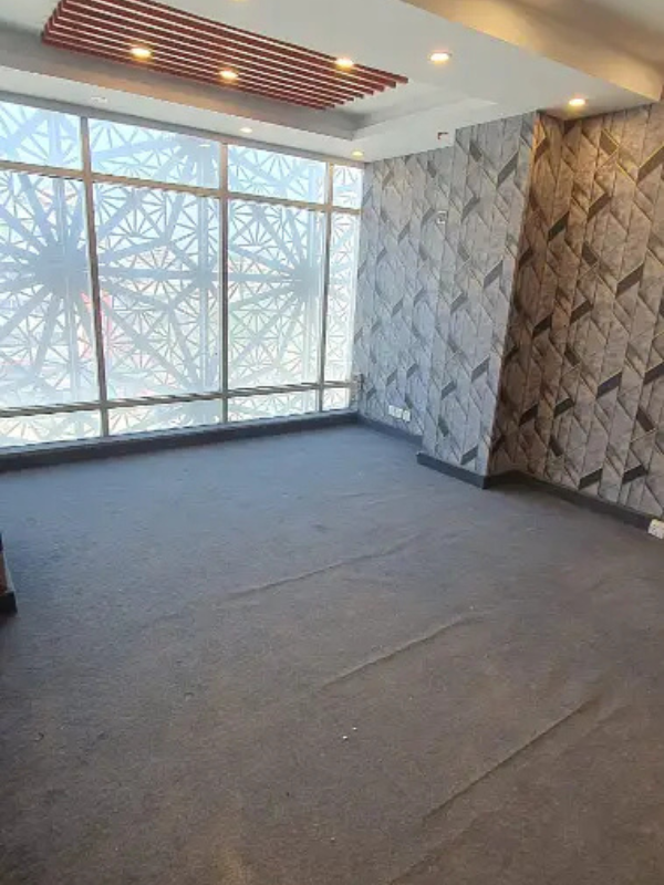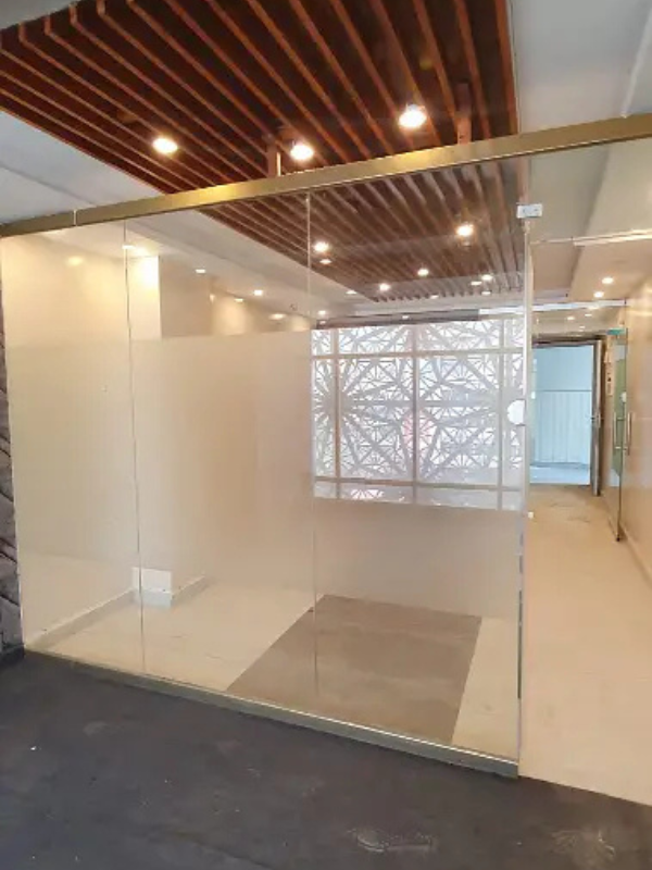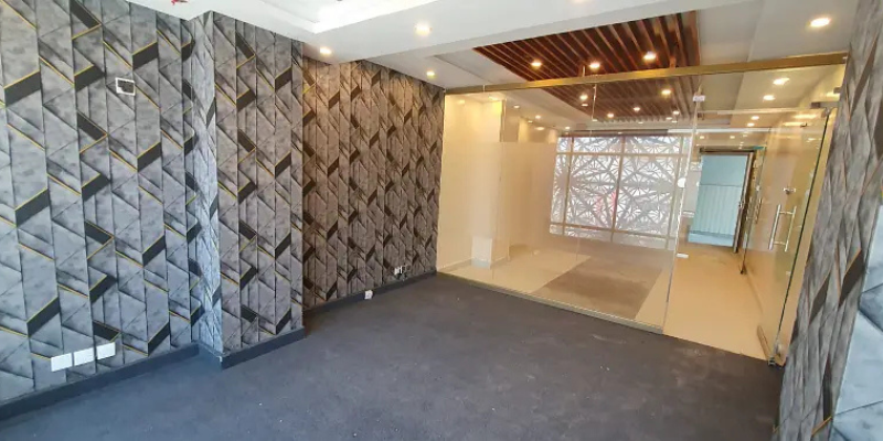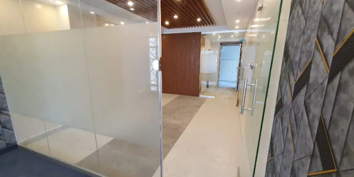 Ready-to-move office for rent featuring fancy false ceilings, glass chambers, and a kitchen. Original pictures available.