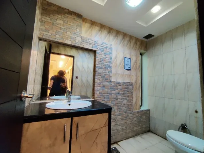 Office for rent on the 1st floor in Gulshan-e-Iqbal Block 13-C. Includes a large hall and a separate room, both with attached washrooms, within a well-maintained commercial building.